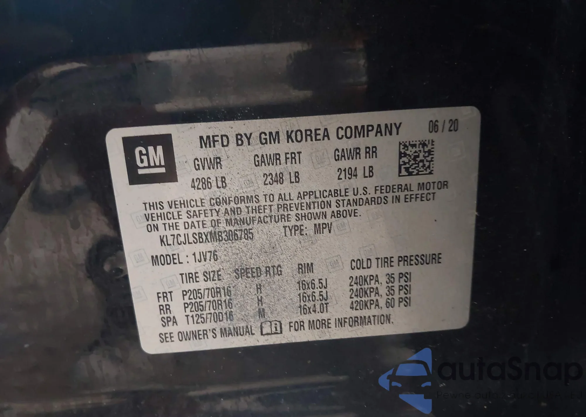 VIN: KL7CJLSBXMB306785