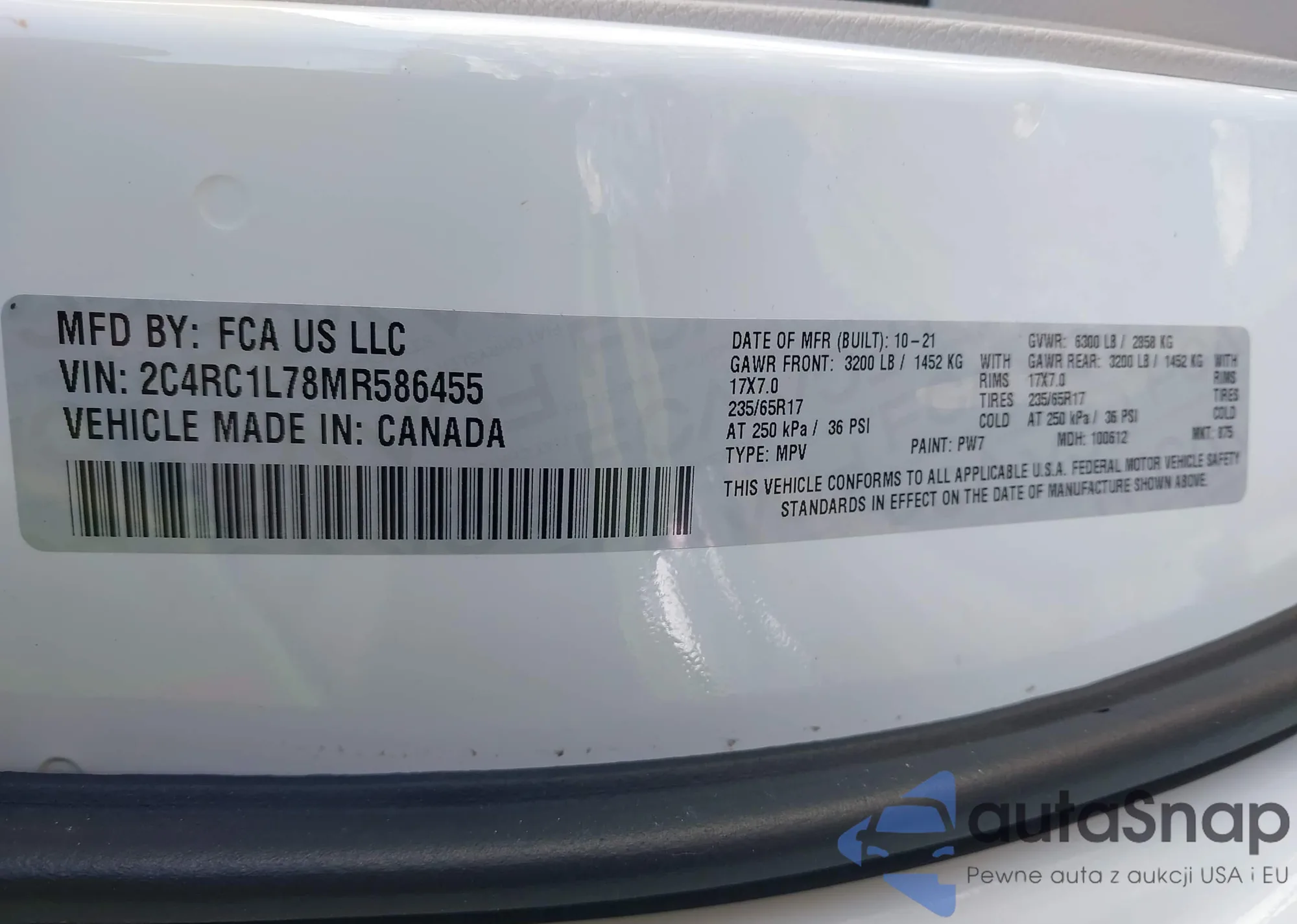 • VIN: 2C4RC1L78MR586455