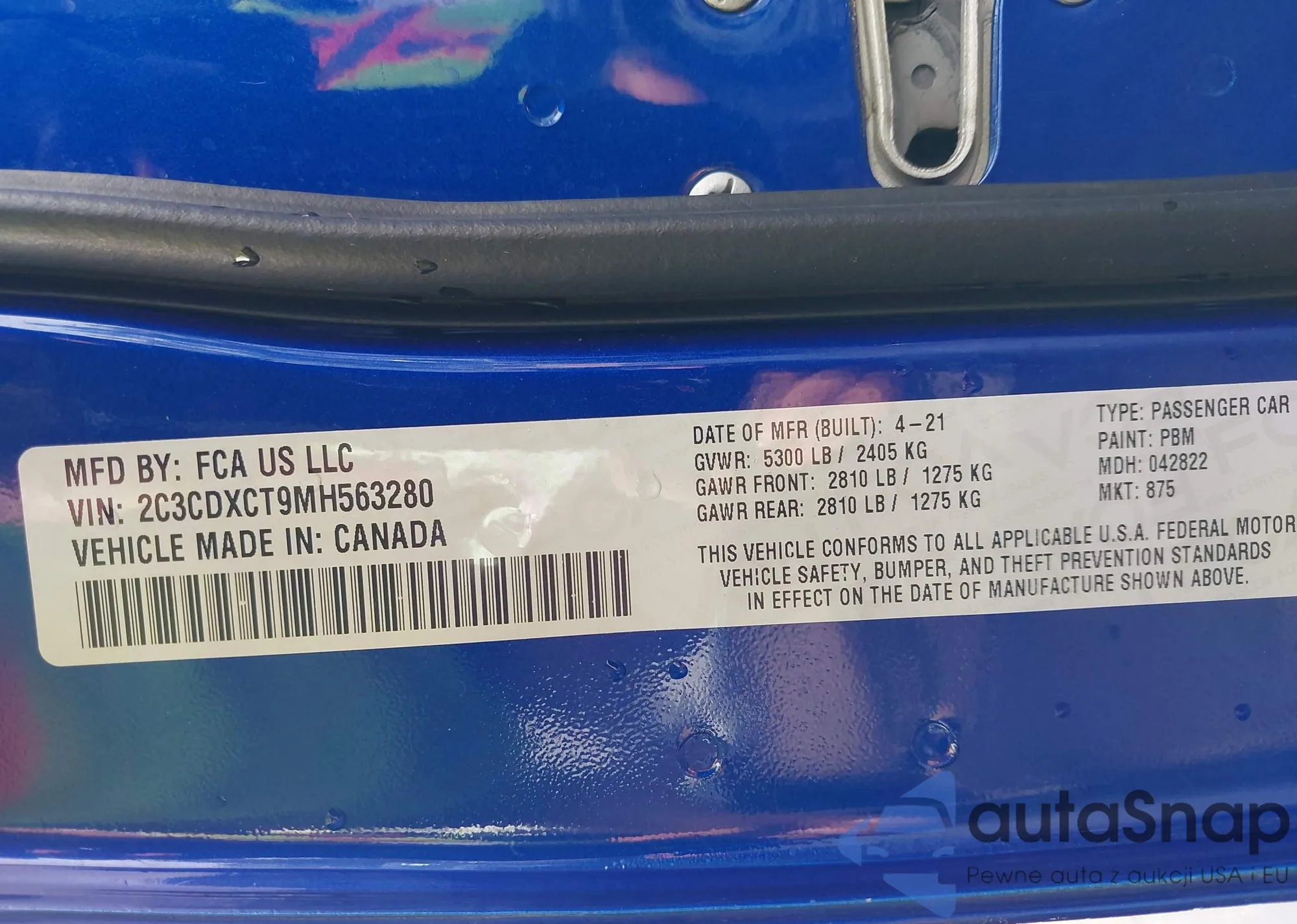 The car Dodge Charger 2021 (VIN 2C3CDXCT9MH563280) has not been auctioned before. The documents are clean, and the mileage matches or is below the market average. Sold by an insurance company – we recommend purchase. Delivery to the port will take approx. 6–8 weeks.