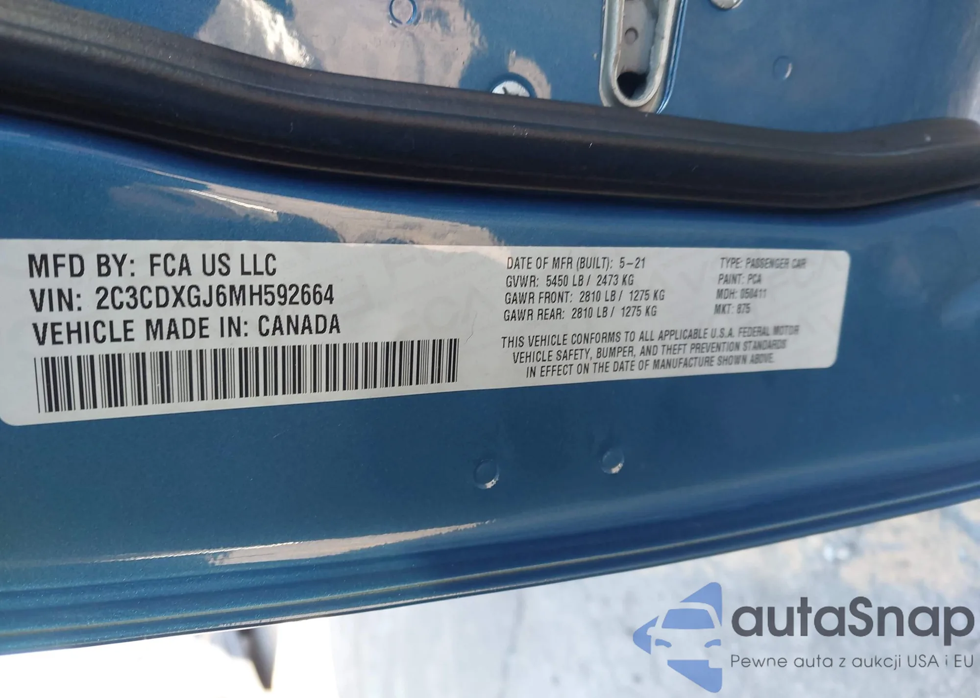 The car Dodge Charger 2021 (VIN 2C3CDXGJ6MH592664) has not been auctioned before. The documents are clean, and the mileage matches or is below the market average. Sold by an insurance company – we recommend purchase. Delivery to the port will take approx. 6–8 weeks.
