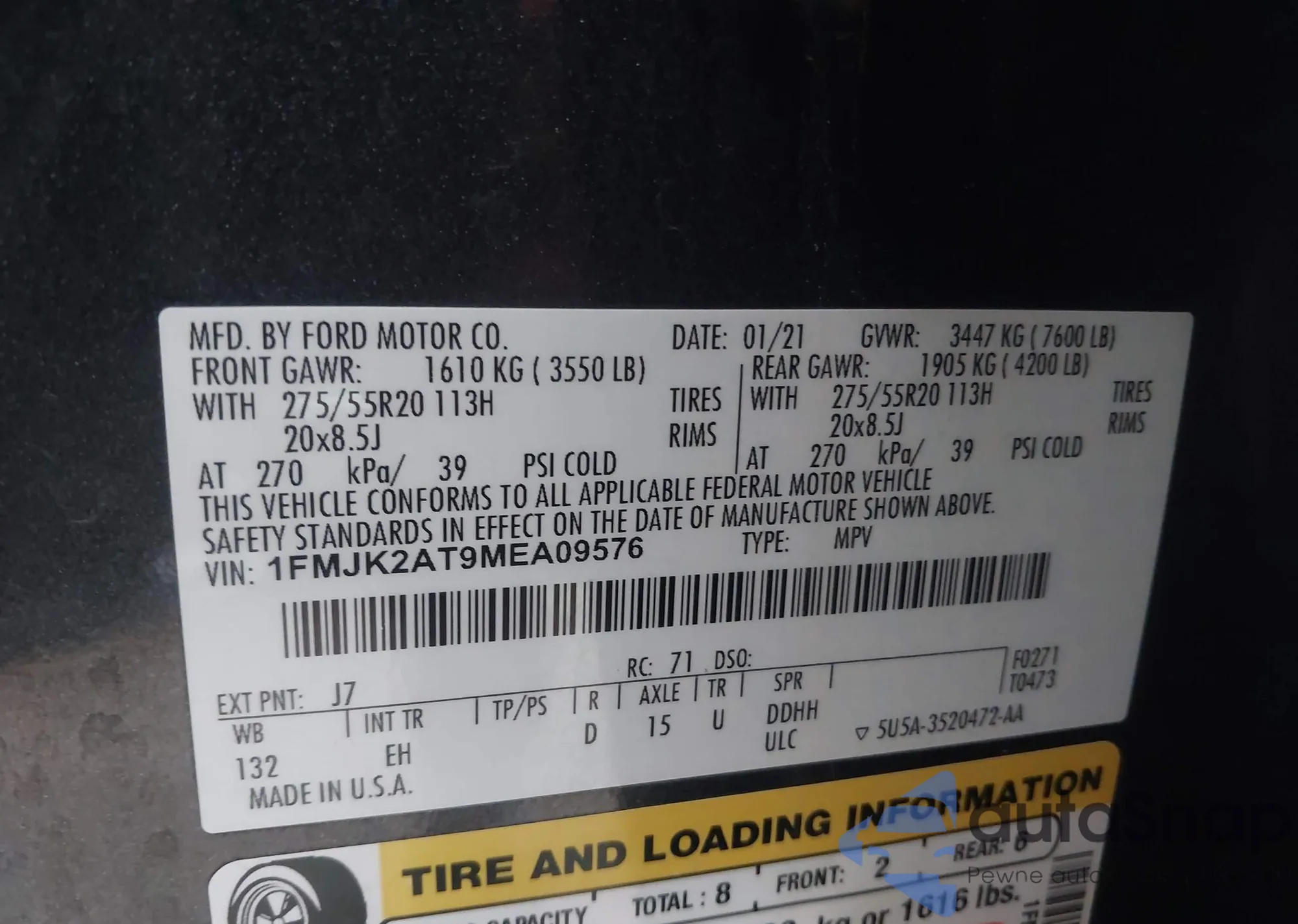 The car Ford Expedition 2021 (VIN 1FMJK2AT9MEA09576) has not been auctioned before. The documents are clean, and the mileage matches or is below the market average. Sold by an insurance company – we recommend purchase. Delivery to the port will take approx. 6–8 weeks.