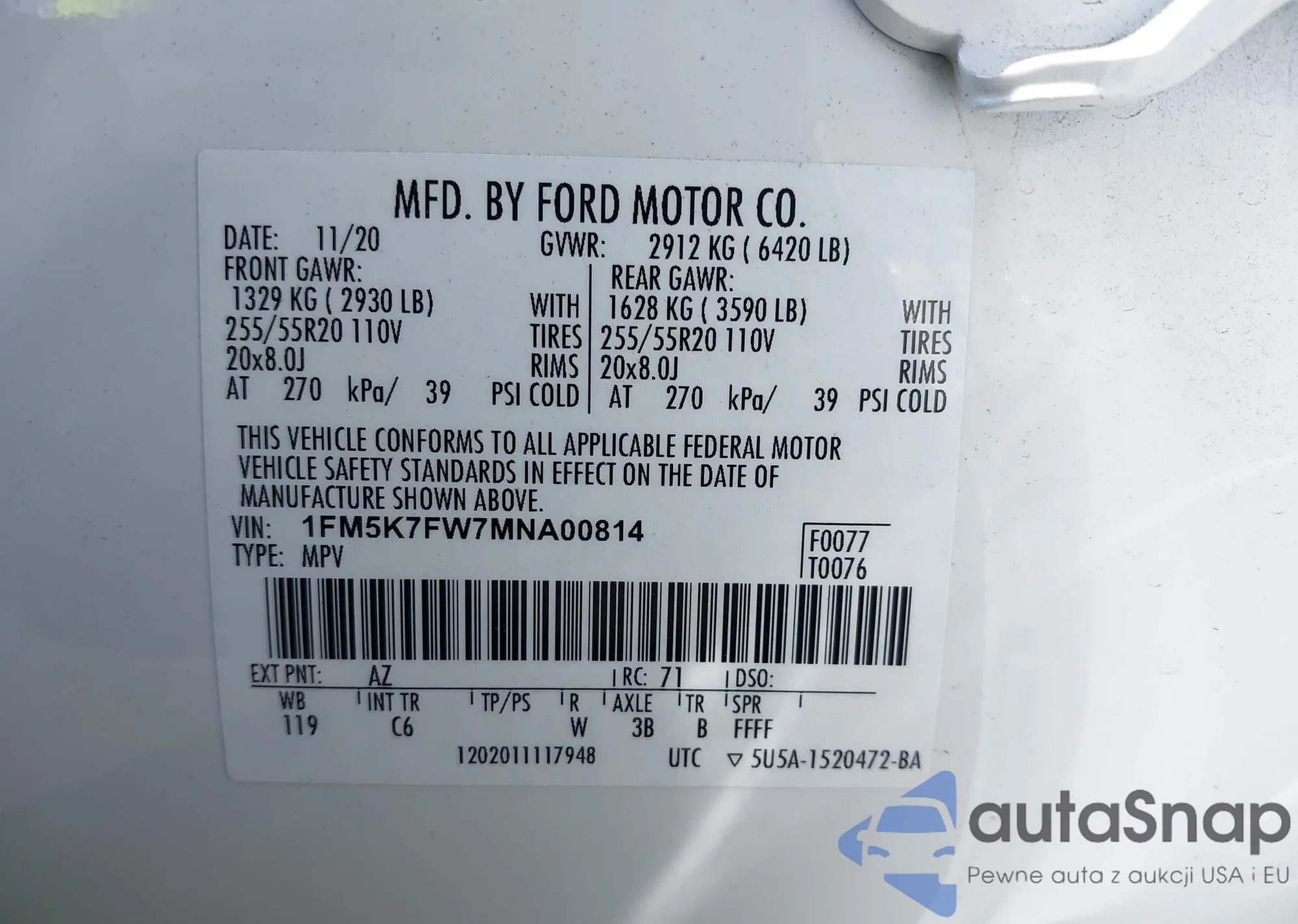VIN: 1FM5K7FW7MNA00814