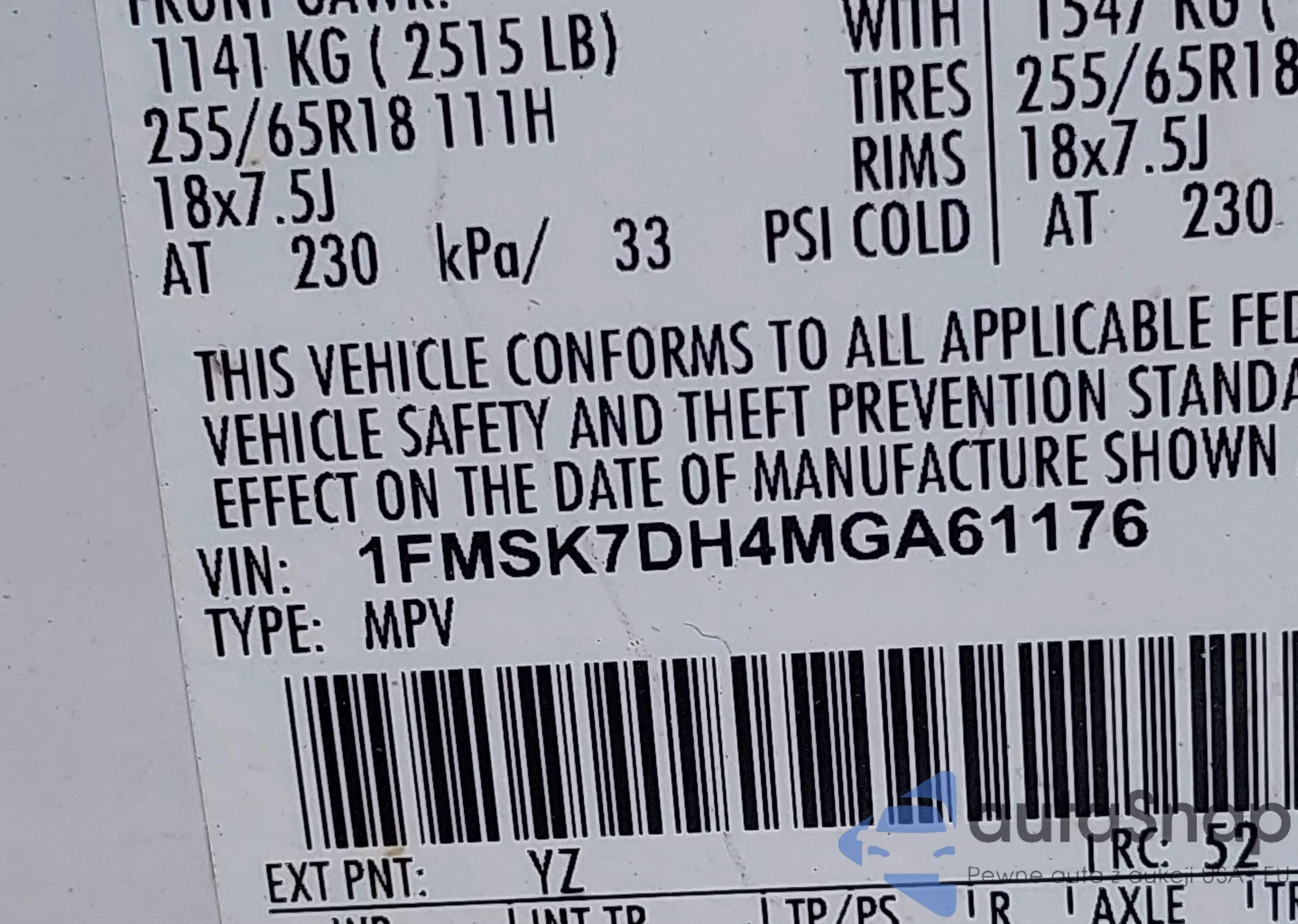 • VIN: 1FMSK7DH4MGA61176
