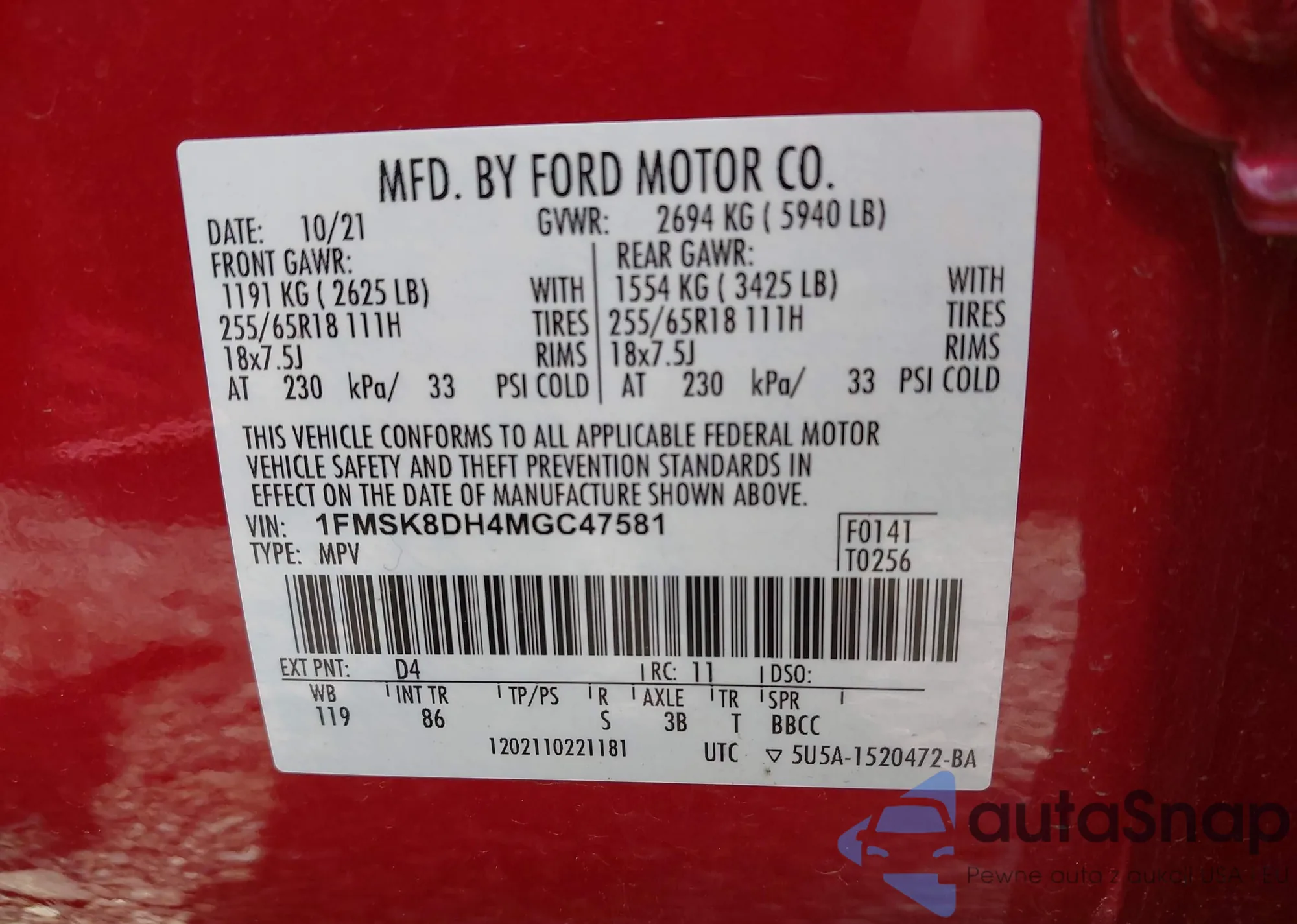 VIN: 1FMSK8DH4MGC47581