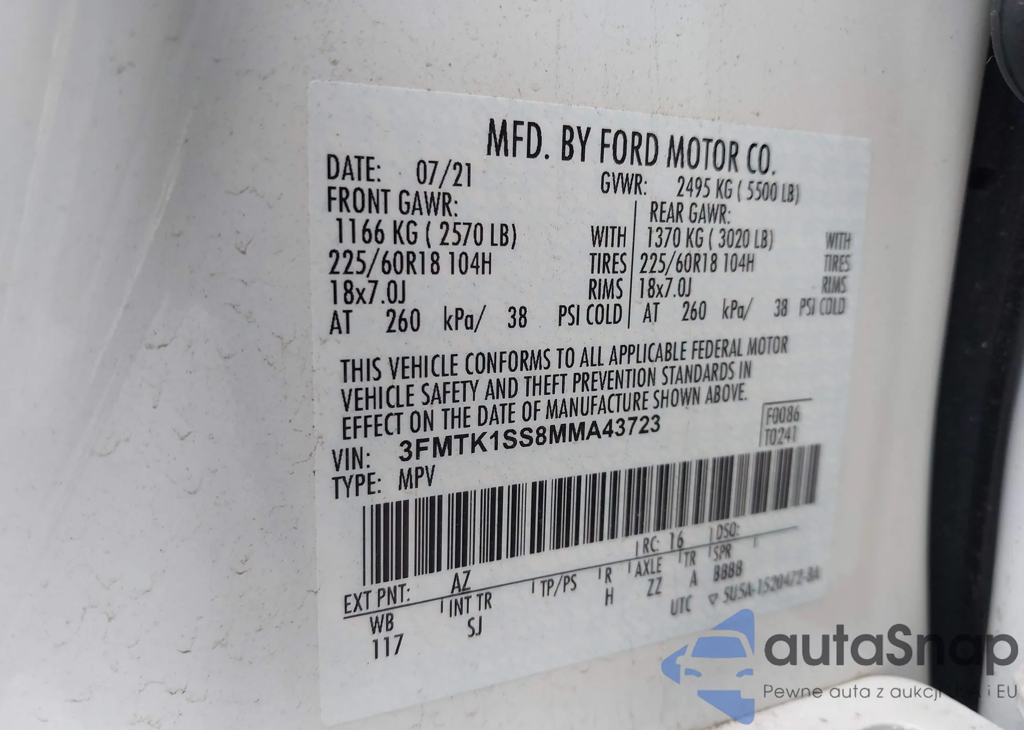 The car Ford Mustang Mach-E 2021 (VIN 3FMTK1SS8MMA43723) is sold by an unverified seller. We recommend checking the Carfax report and confirming registration possibilities before purchase.