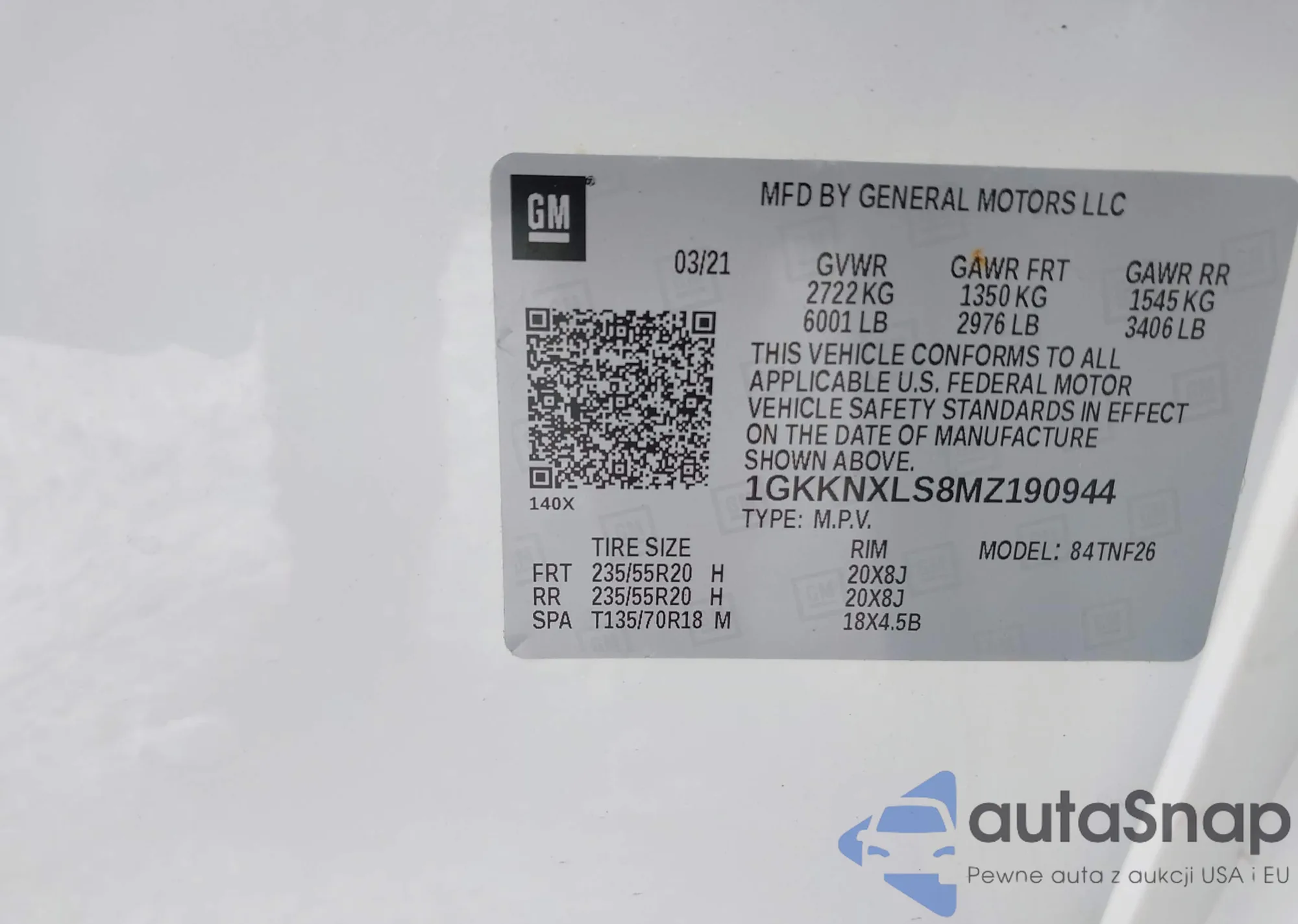 The car GMC Acadia 2021 (VIN 1GKKNXLS8MZ190944) has not been auctioned before. The documents are clean, and the mileage matches or is below the market average. Sold by an insurance company – we recommend purchase. Delivery to the port will take approx. 6–8 weeks.