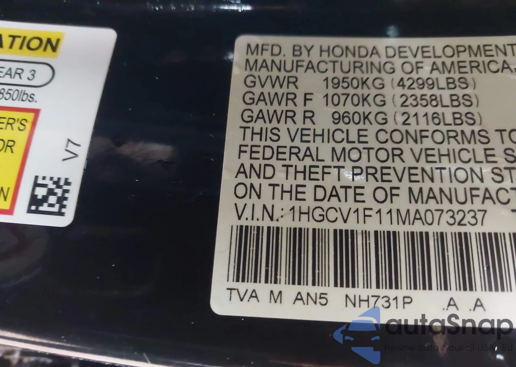 • VIN: 1HGCV1F11MA073237