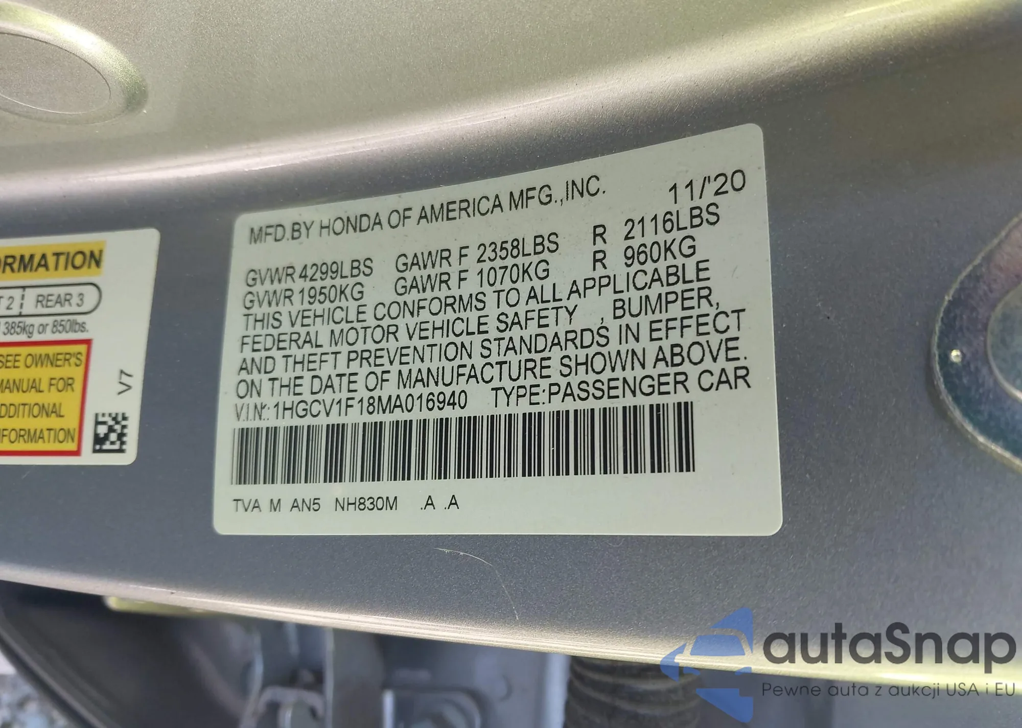 • VIN: 1HGCV1F18MA016940