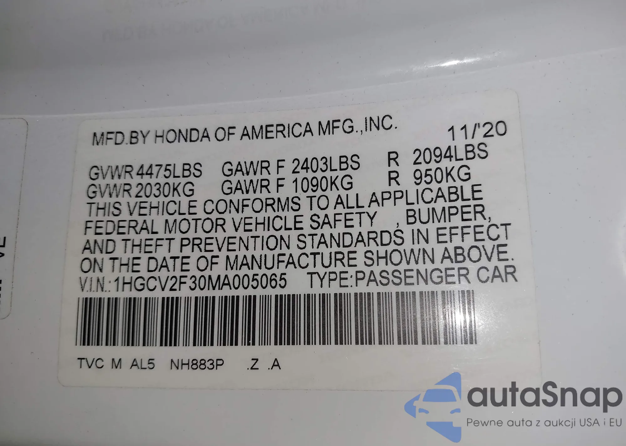 VIN: 1HGCV2F30MA005065