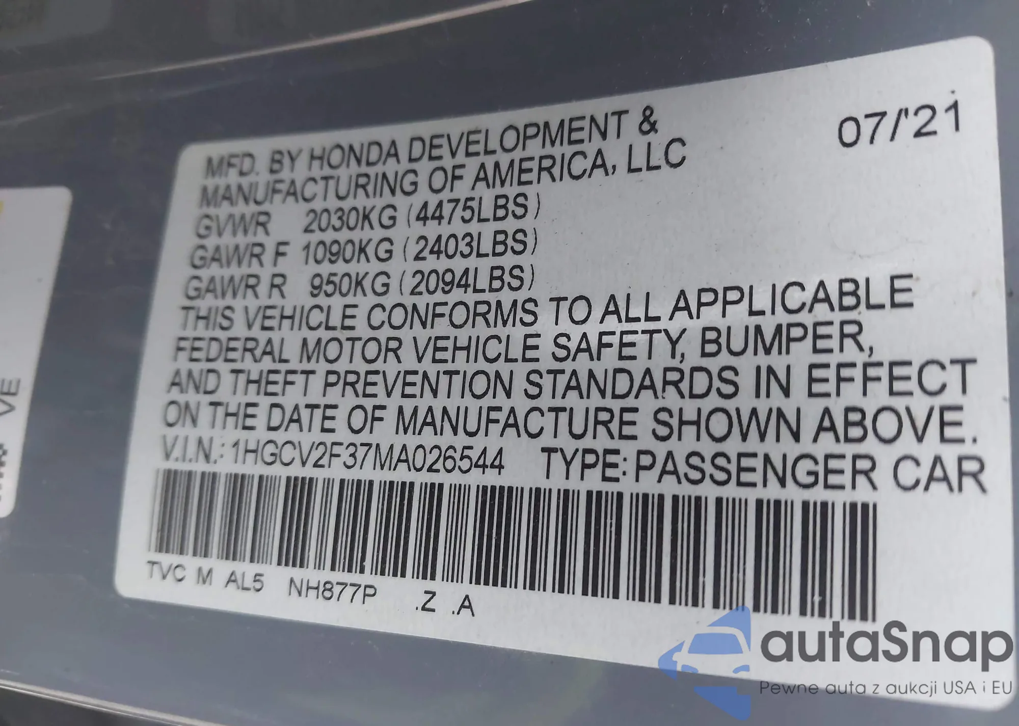 • VIN: 1HGCV2F37MA026544