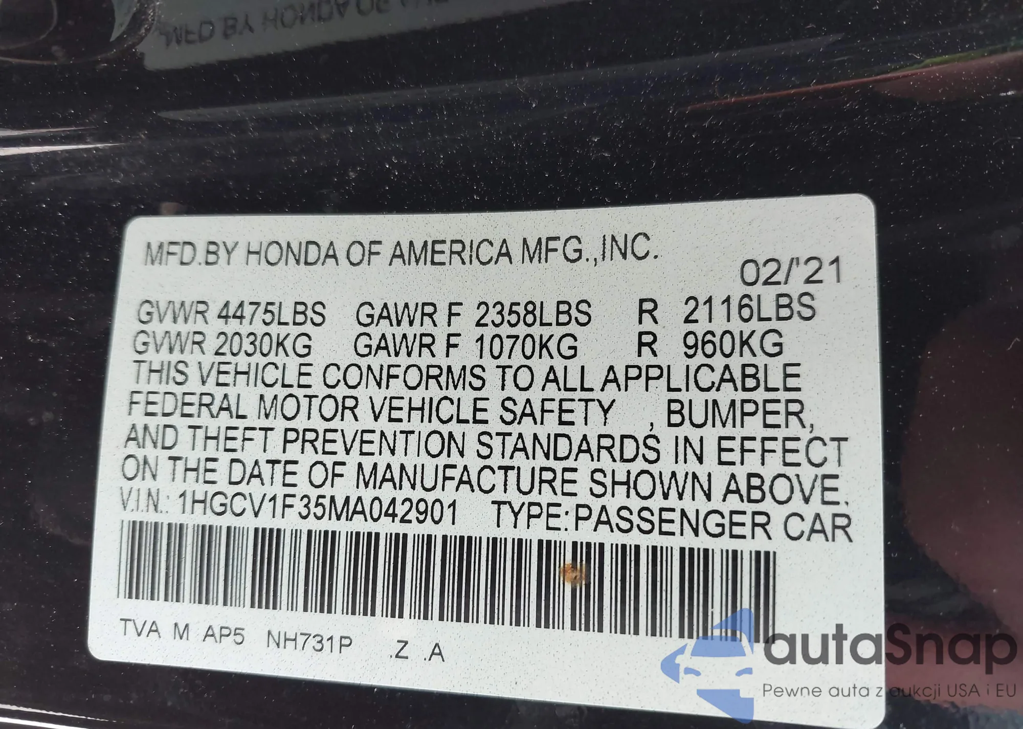VIN: 1HGCV1F35MA042901
