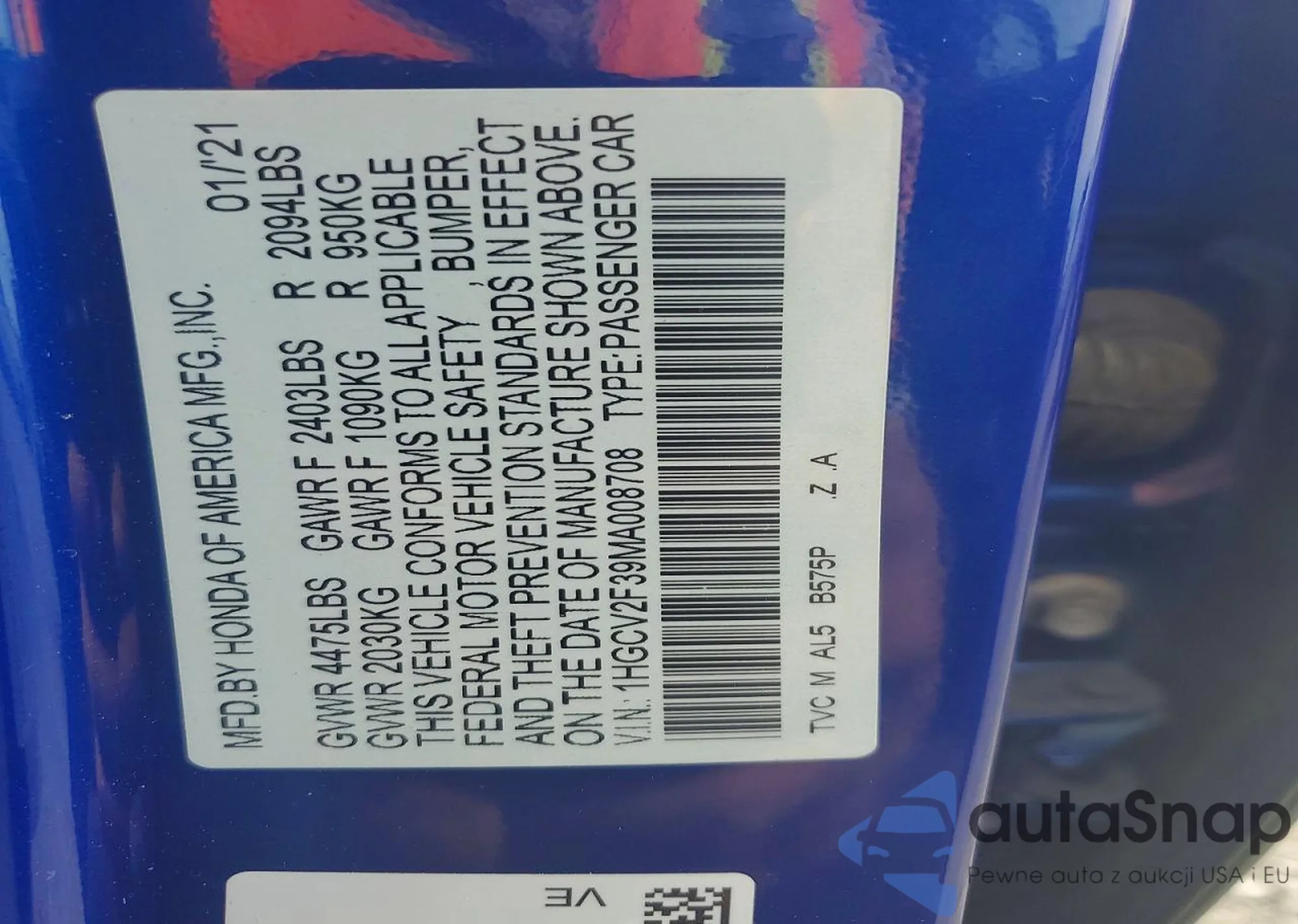 The car Honda Accord 2021 (VIN 1HGCV2F39MA008708) has not been auctioned before. The documents are clean, and the mileage matches or is below the market average. Sold by an insurance company – we recommend purchase. Delivery to the port will take approx. 6–8 weeks.