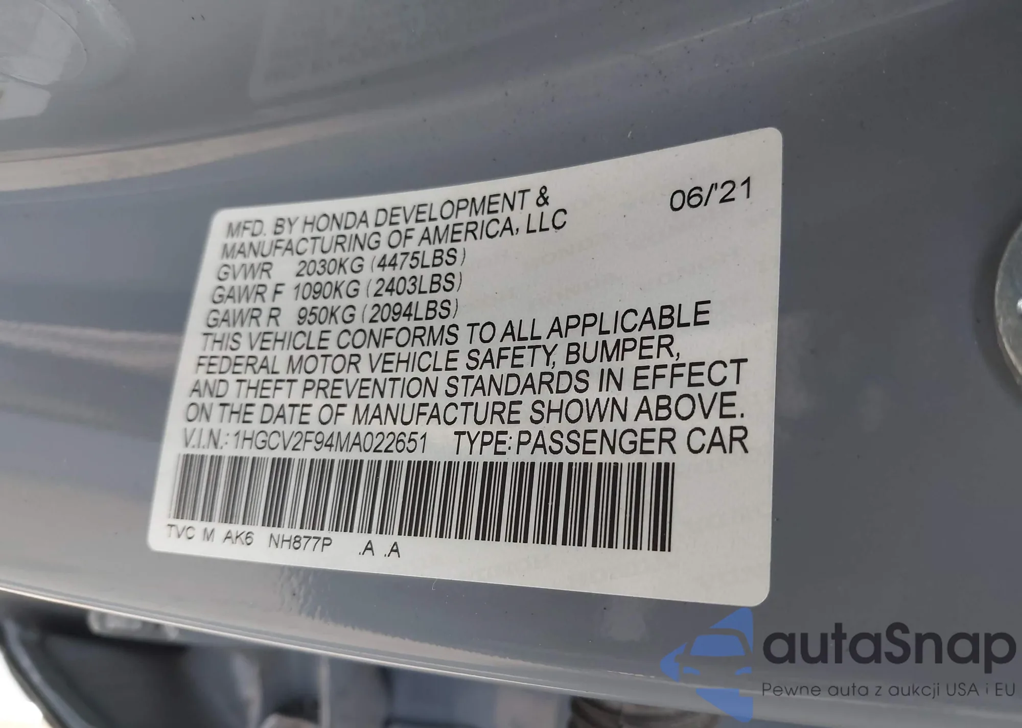 • VIN: 1HGCV2F94MA022651