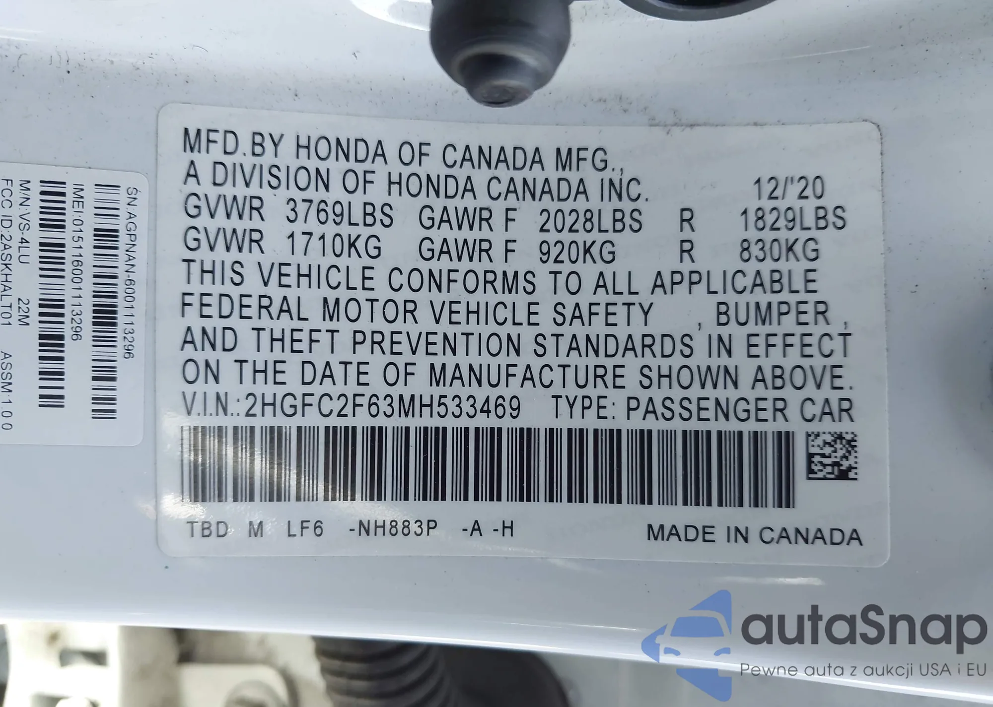 The car Honda Civic 2021 (VIN 2HGFC2F63MH533469) has not been auctioned before. The documents are clean, and the mileage matches or is below the market average. Sold by an insurance company – we recommend purchase. Delivery to the port will take approx. 6–8 weeks.