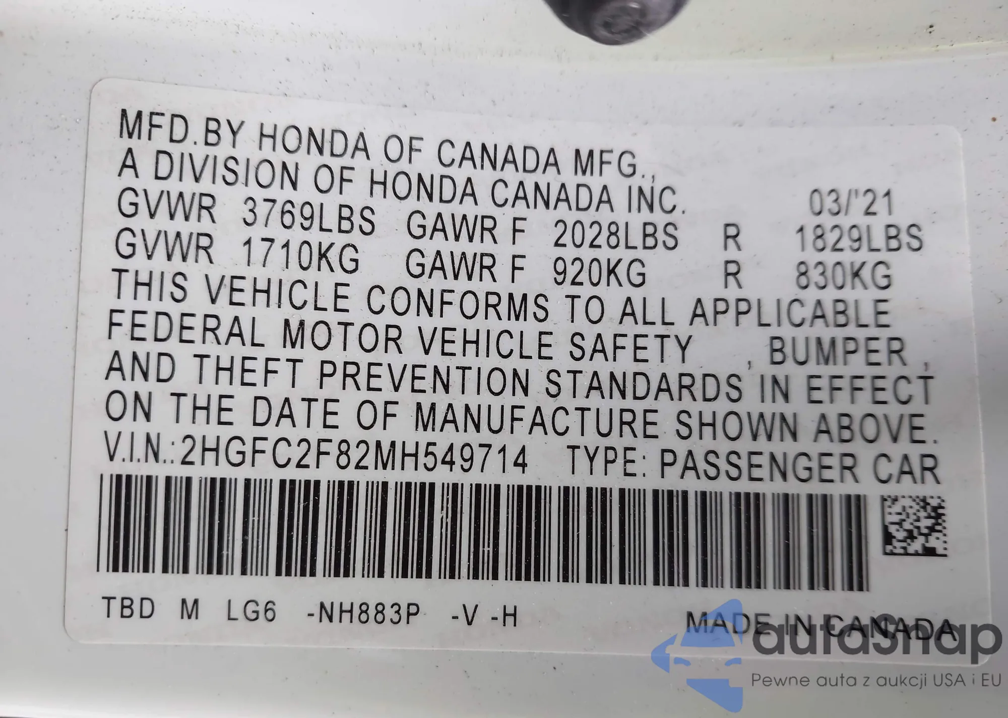 VIN: 2HGFC2F82MH549714