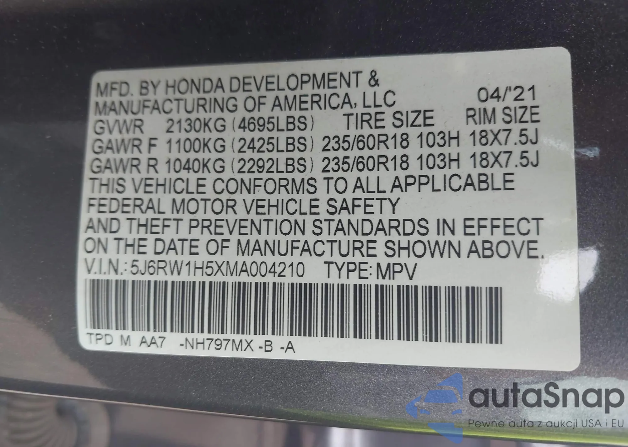 VIN: 5J6RW1H5XMA004210