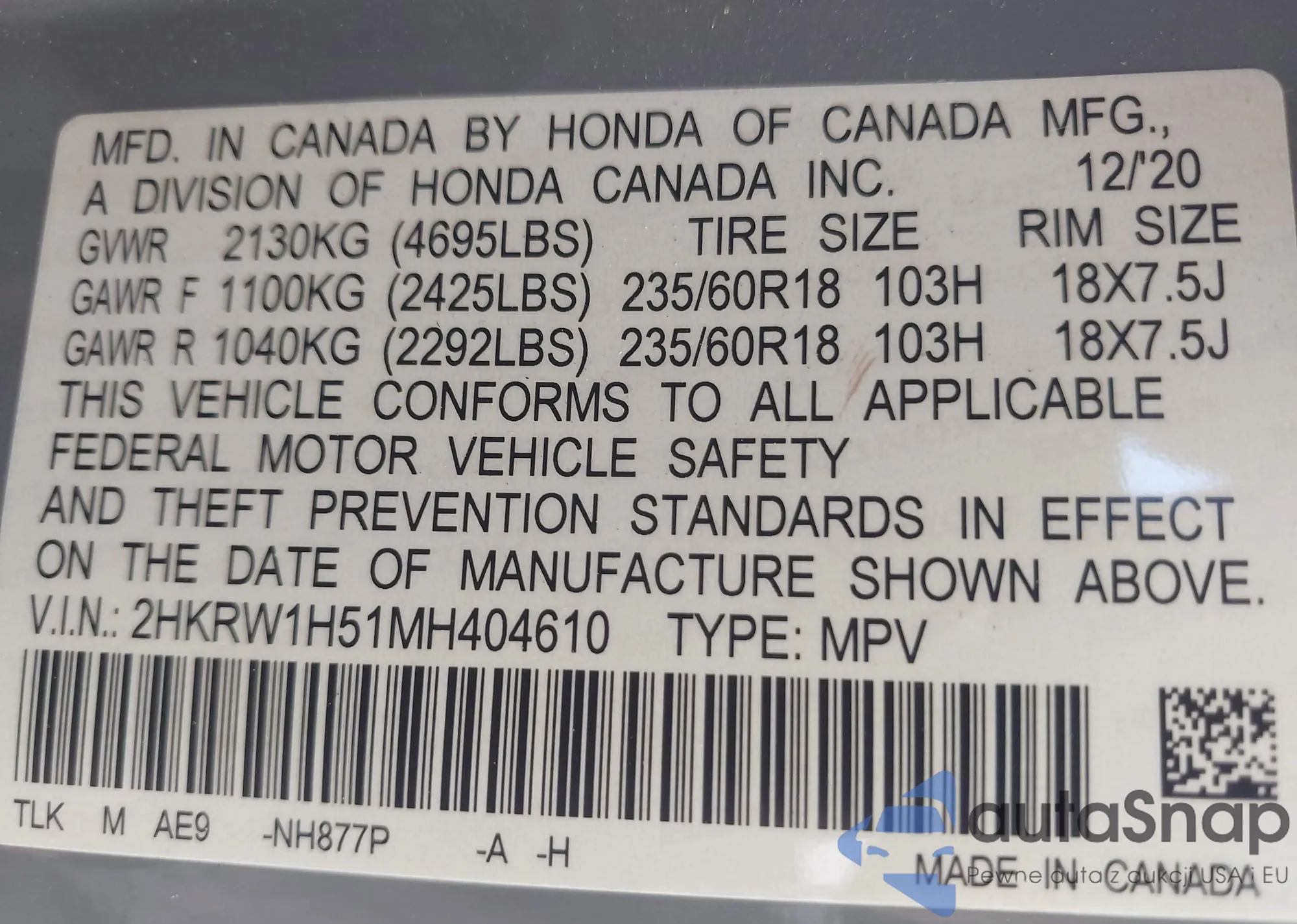 VIN: 2HKRW1H51MH404610