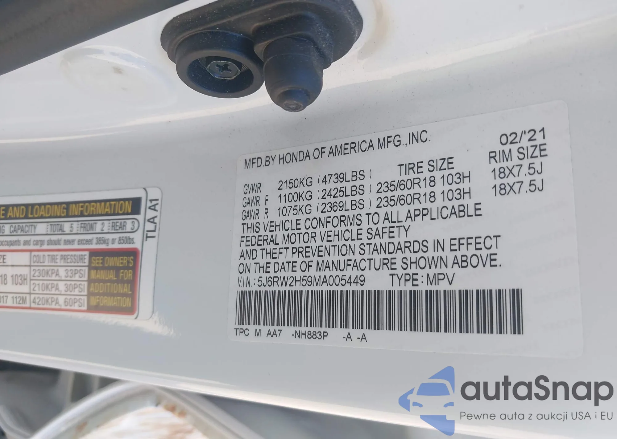 • VIN: 5J6RW2H59MA005449