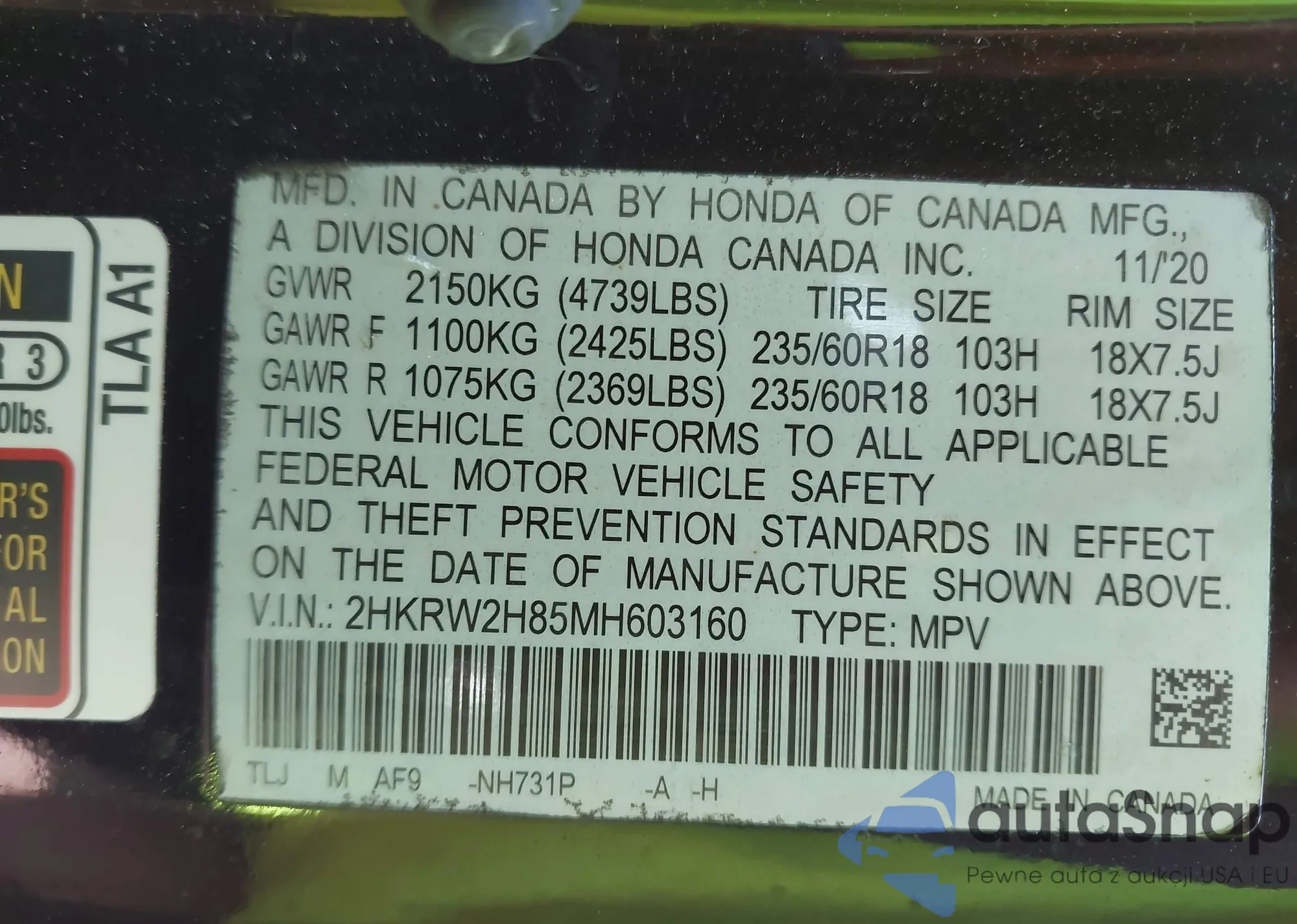 VIN: 2HKRW2H85MH603160