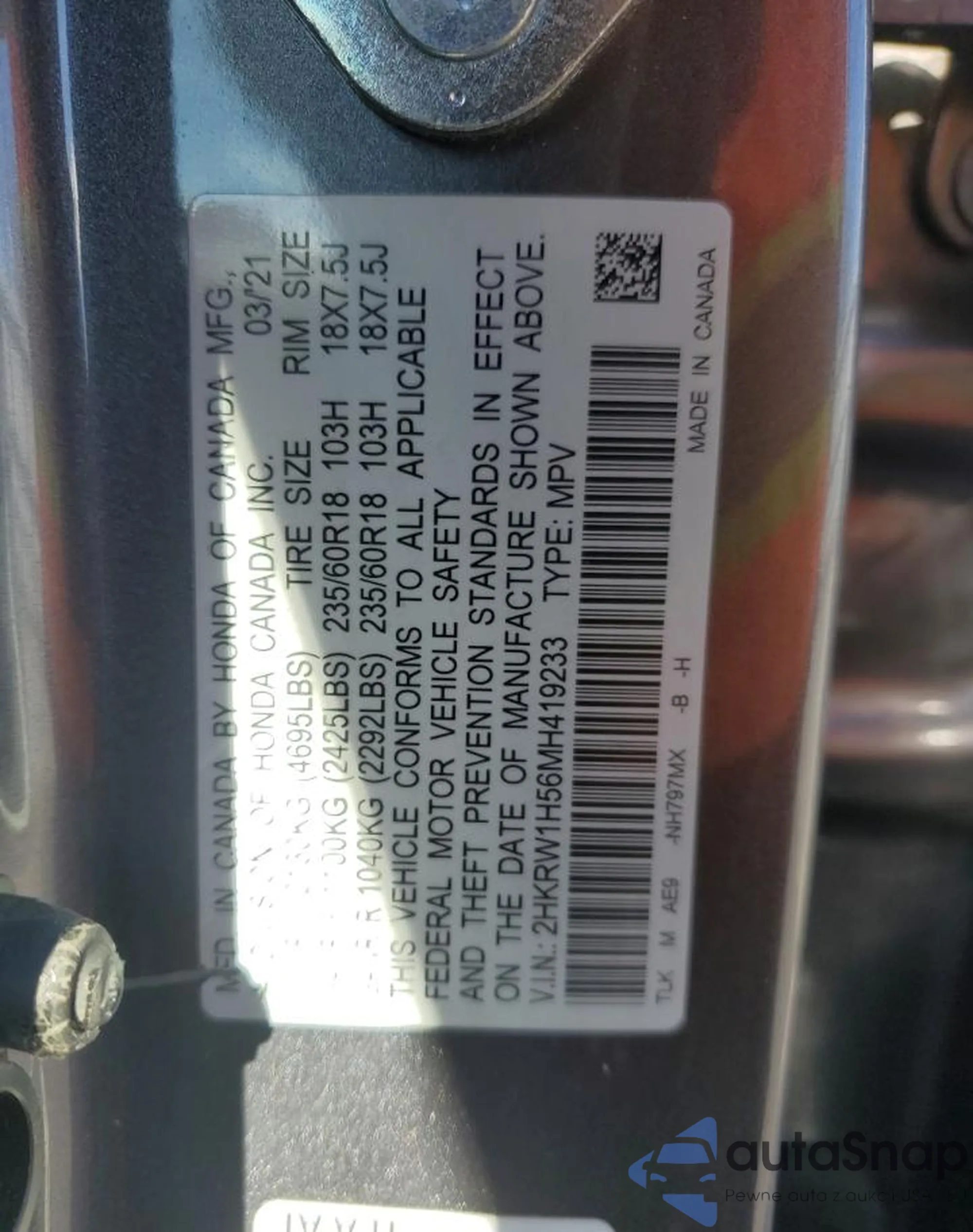 VIN: 2HKRW1H56MH419233