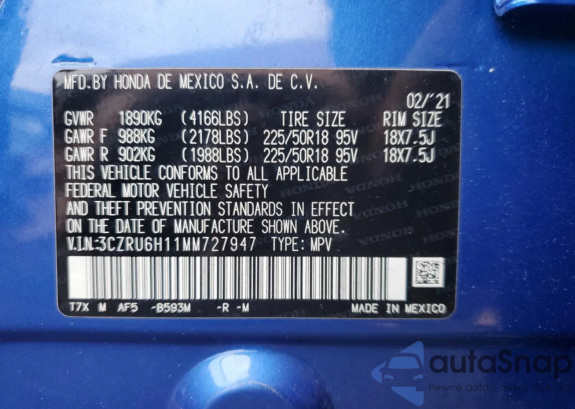 The car Honda HR-V 2021 (VIN 3CZRU6H11MM727947) has documents that prevent registration. Export and registration may be difficult. Contact AutaSnap experts to find alternatives.