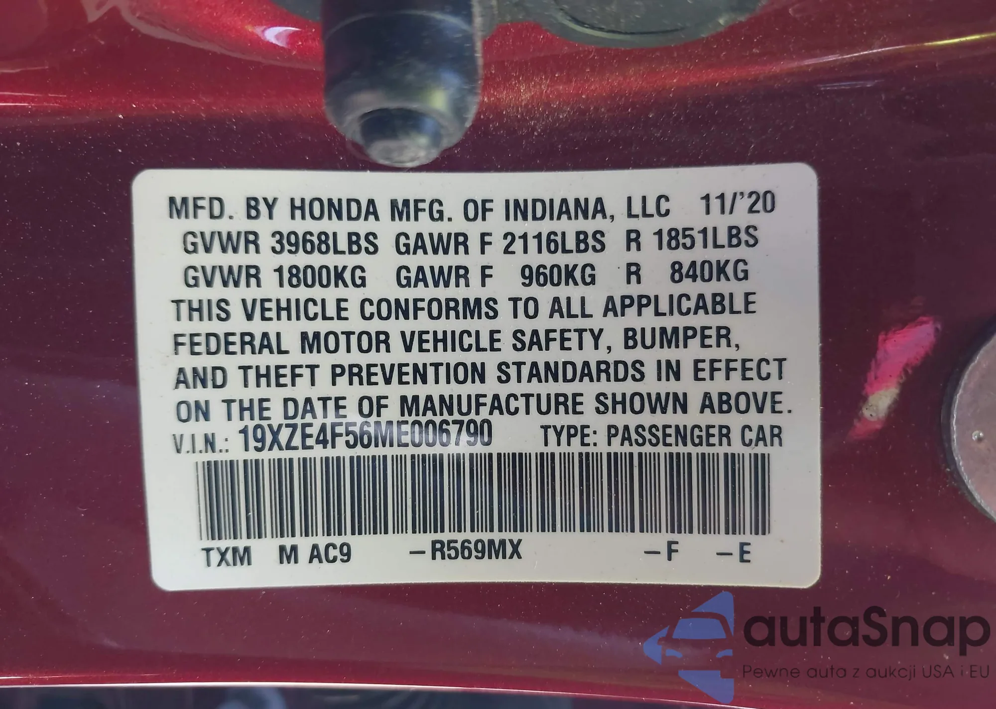 VIN: 19XZE4F56ME006790