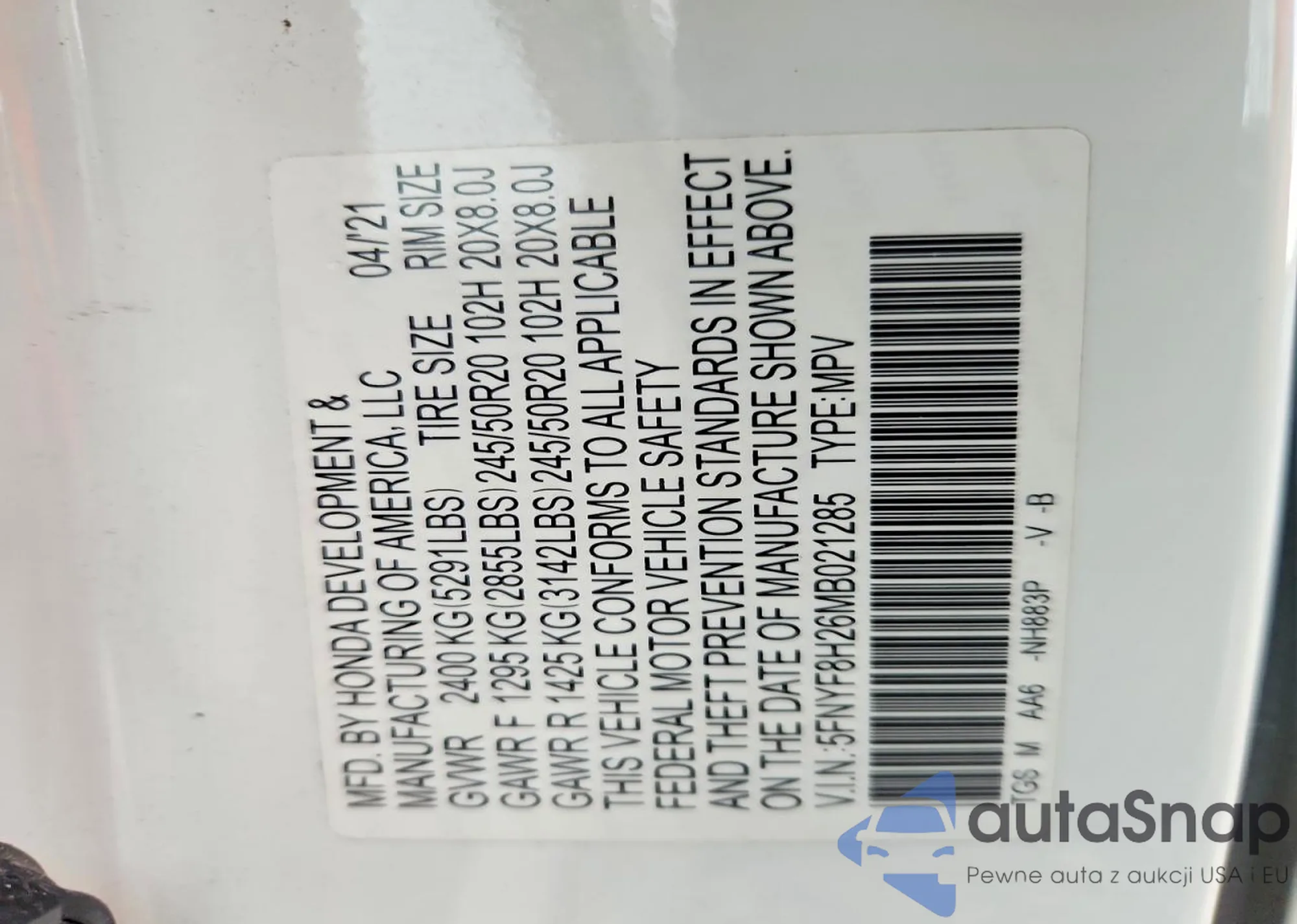 The car Honda Passport 2021 (VIN 5FNYF8H26MB021285) is sold by an unverified seller. We recommend checking the Carfax report and confirming registration possibilities before purchase.