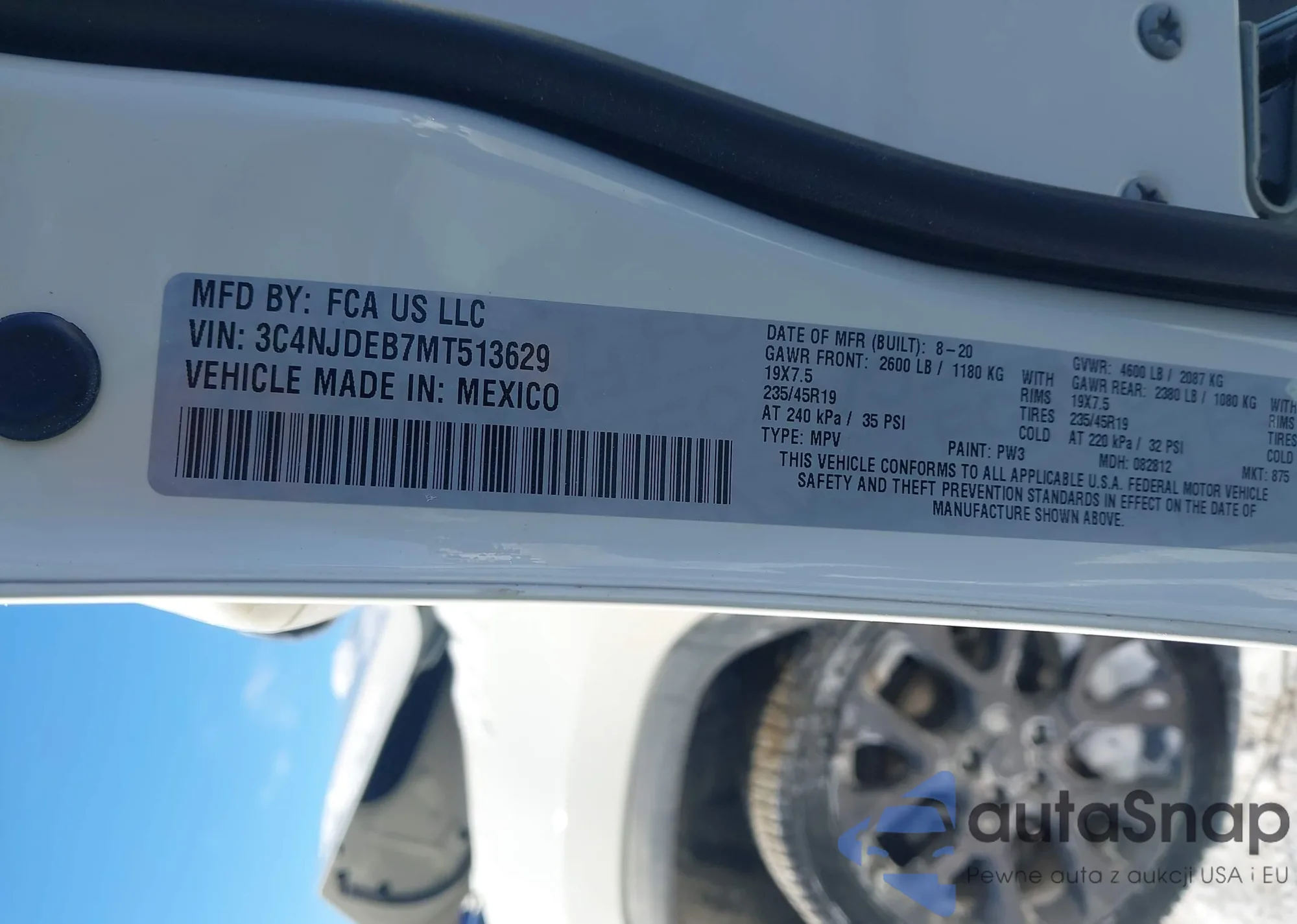 The car Jeep Compass 2021 (VIN 3C4NJDEB7MT513629) has not been auctioned before. The documents are clean, and the mileage matches or is below the market average. Sold by an insurance company – we recommend purchase. Delivery to the port will take approx. 6–8 weeks.