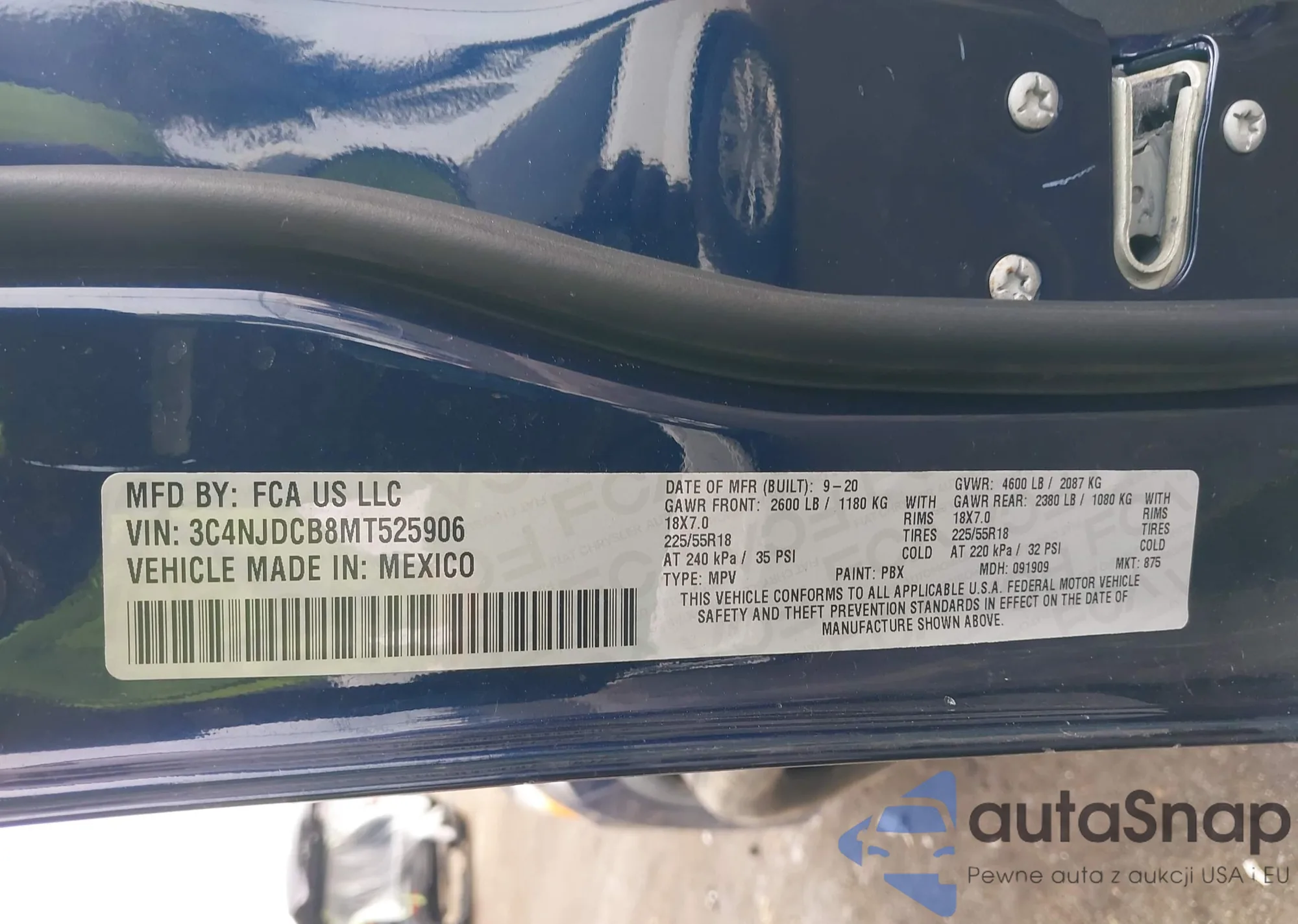 The car Jeep Compass 2021 (VIN 3C4NJDCB8MT525906) has documents that prevent registration. Export and registration may be difficult. Contact AutaSnap experts to find alternatives.