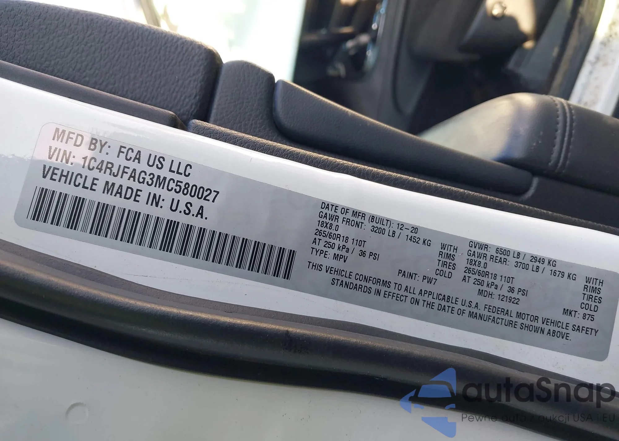 The car Jeep Grand Cherokee 2021 (VIN 1C4RJFAG3MC580027) has not been auctioned before. The documents are clean, and the mileage matches or is below the market average. Sold by an insurance company – we recommend purchase. Delivery to the port will take approx. 6–8 weeks.