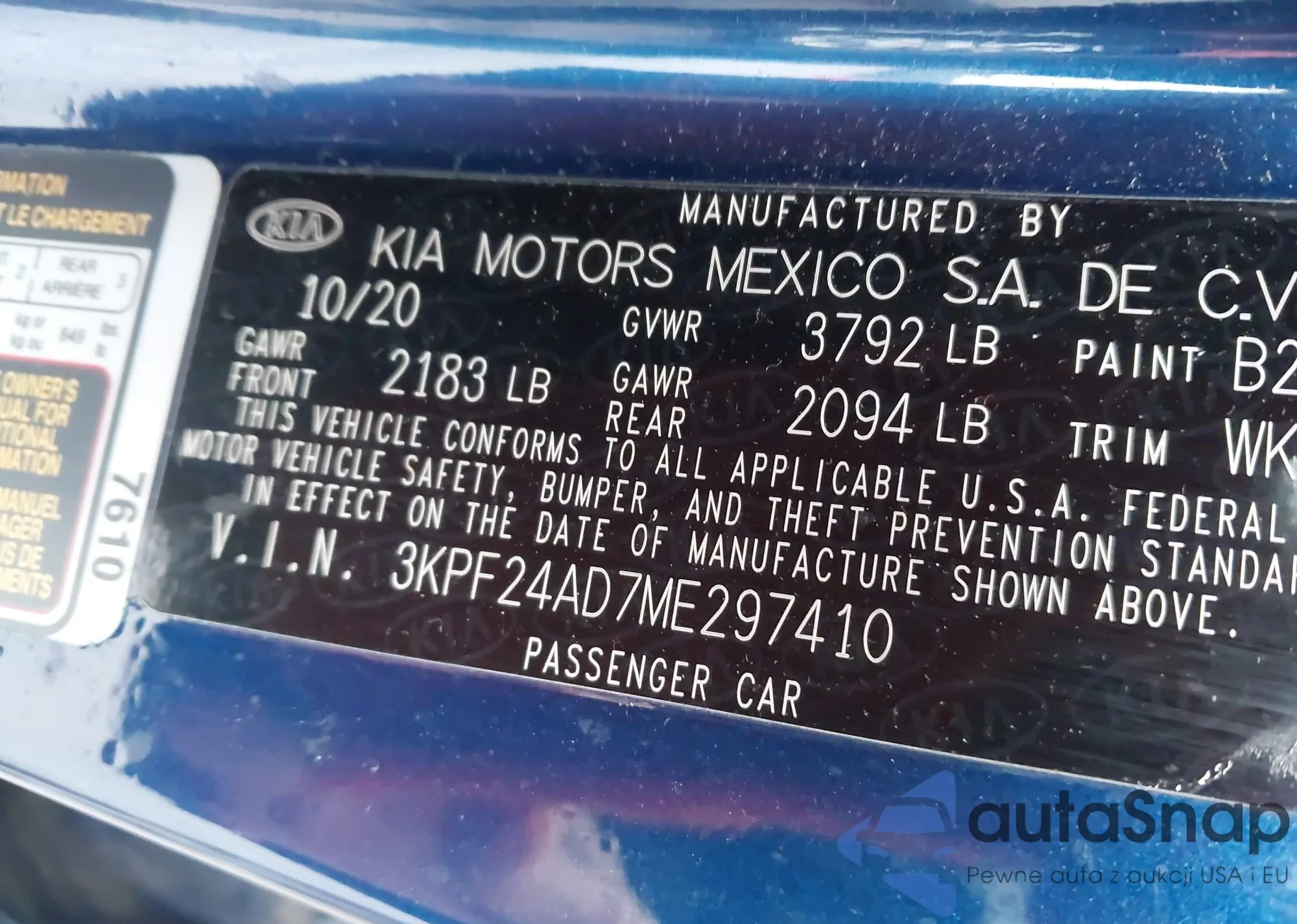 The car Kia Forte 2021 (VIN 3KPF24AD7ME297410) has not been auctioned before. The documents are clean, and the mileage matches or is below the market average. Sold by an insurance company – we recommend purchase. Delivery to the port will take approx. 6–8 weeks.