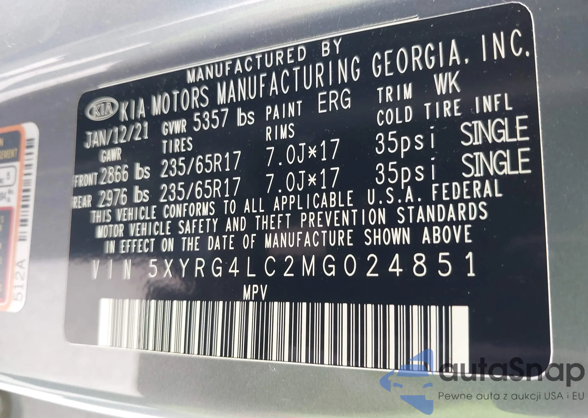 The car Kia Sorento 2021 (VIN 5XYRG4LC2MG024851) has not been auctioned before. The documents are clean, and the mileage matches or is below the market average. Sold by an insurance company – we recommend purchase. Delivery to the port will take approx. 6–8 weeks.