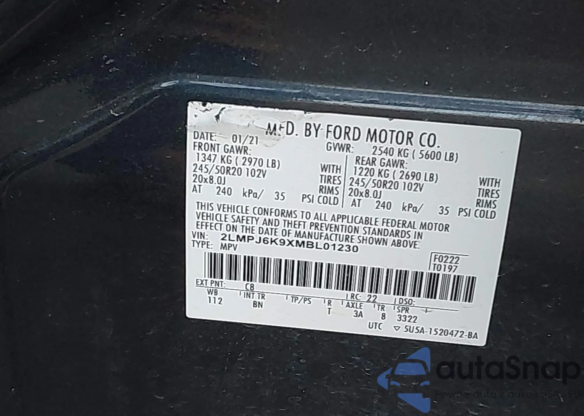 The car Lincoln Nautilus 2021 (VIN 2LMPJ6K9XMBL01230) has not been auctioned before. The documents are clean, and the mileage matches or is below the market average. Sold by an insurance company – we recommend purchase. Delivery to the port will take approx. 6–8 weeks.