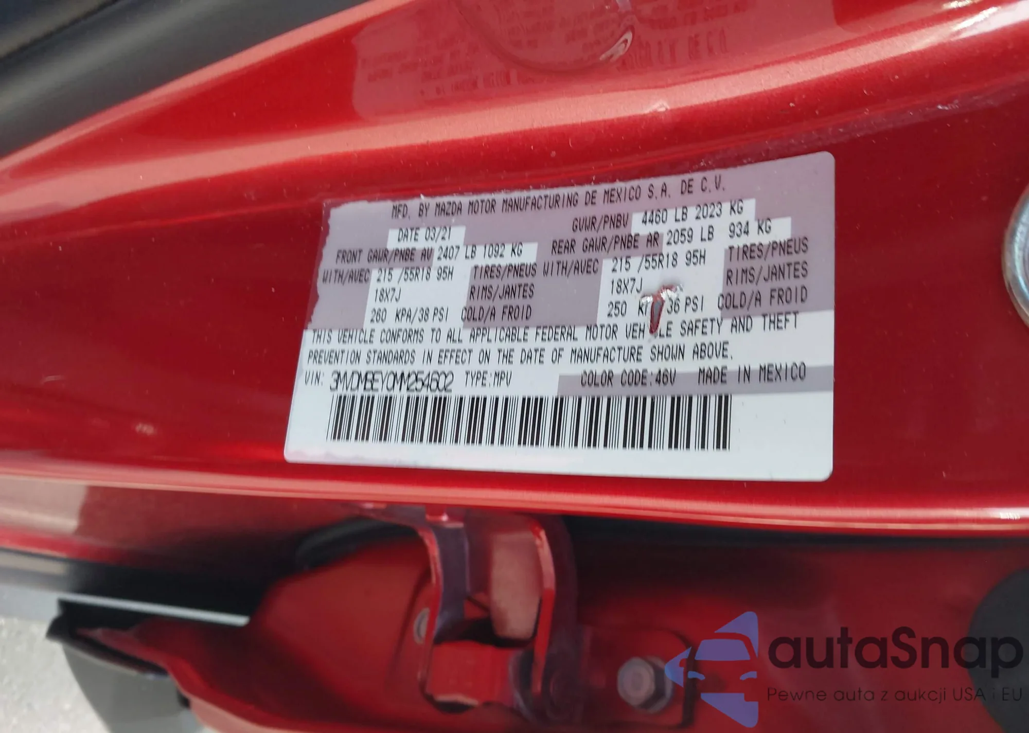 The car Mazda CX-30 2021 (VIN 3MVDMBEY0MM254602) has documents that prevent registration. Export and registration may be difficult. Contact AutaSnap experts to find alternatives.