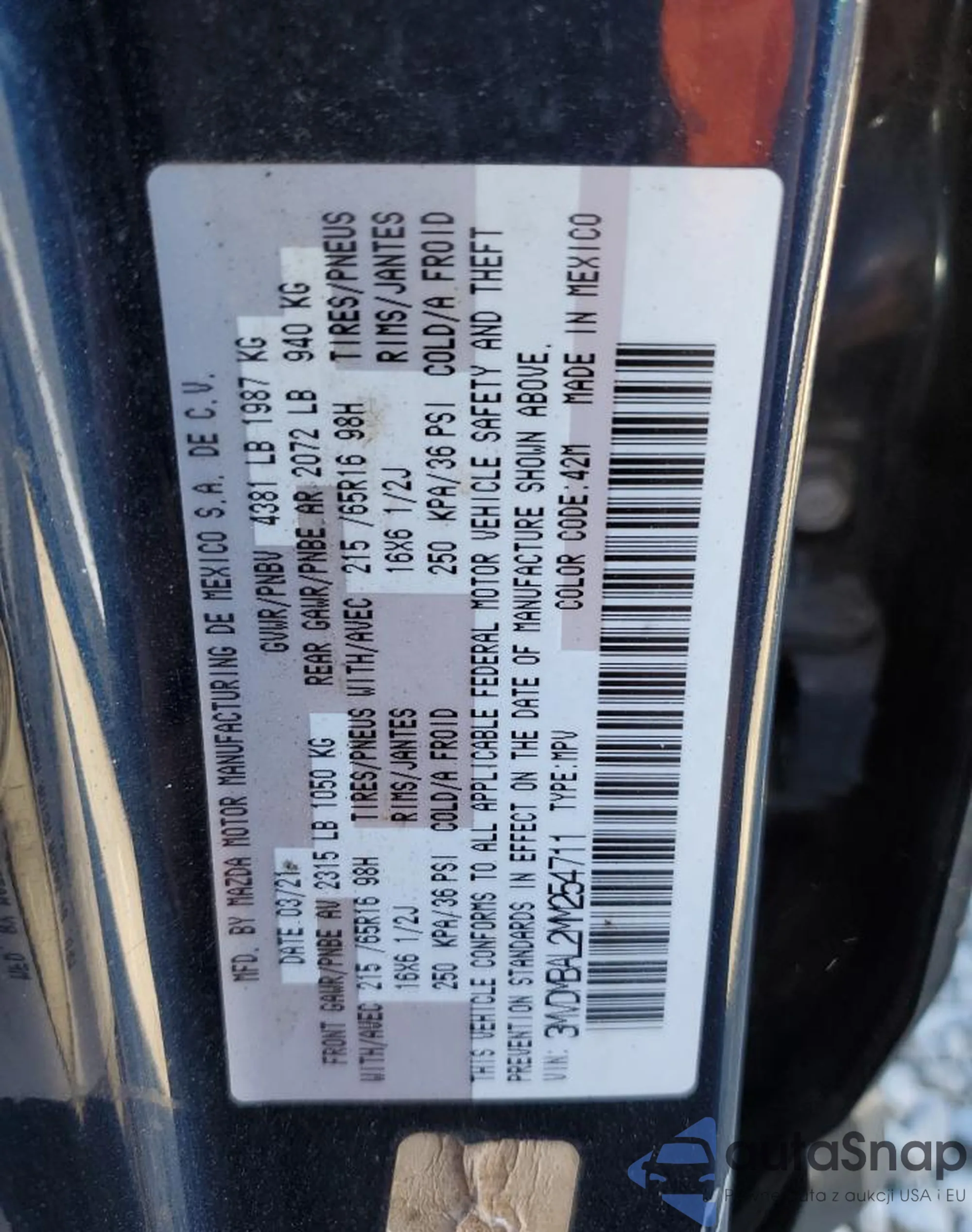 The car Mazda CX-30 2021 (VIN 3MVDMBAL2MM254711) has already been auctioned 0 times or is sold by an unverified seller. We recommend checking the Carfax report and confirming registration possibilities before purchase.