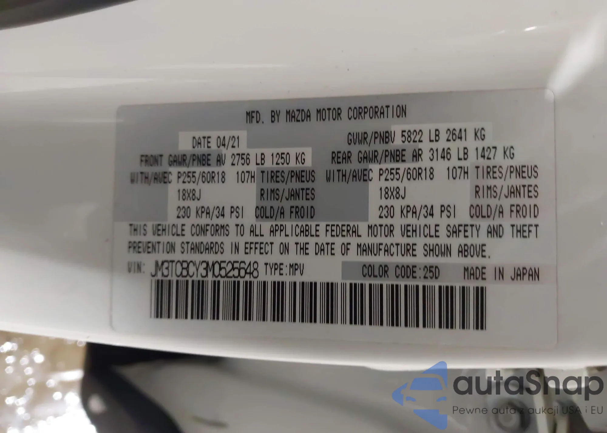 The car Mazda CX-9 2021 (VIN JM3TCBCY3M0525648) has not been auctioned before. The documents are clean, and the mileage matches or is below the market average. Sold by an insurance company – we recommend purchase. Delivery to the port will take approx. 6–8 weeks.