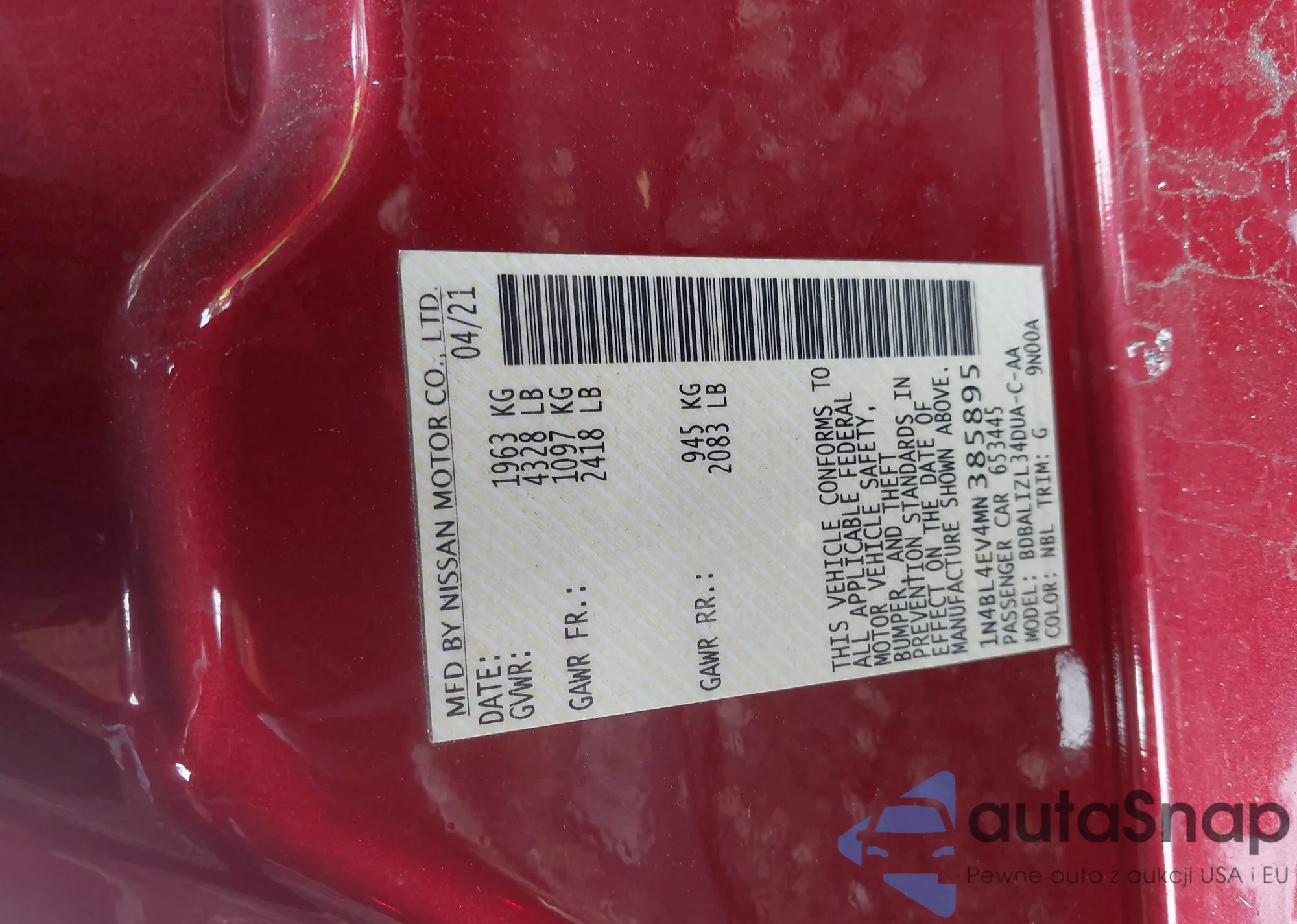 The car Nissan Altima 2021 (VIN 1N4BL4EV4MN385895) has not been auctioned before. The documents are clean, and the mileage matches or is below the market average. Sold by an insurance company – we recommend purchase. Delivery to the port will take approx. 6–8 weeks.