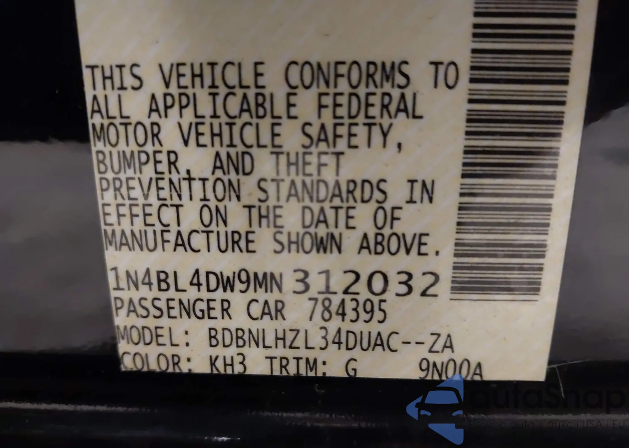 VIN: 1N4BL4DW9MN312032