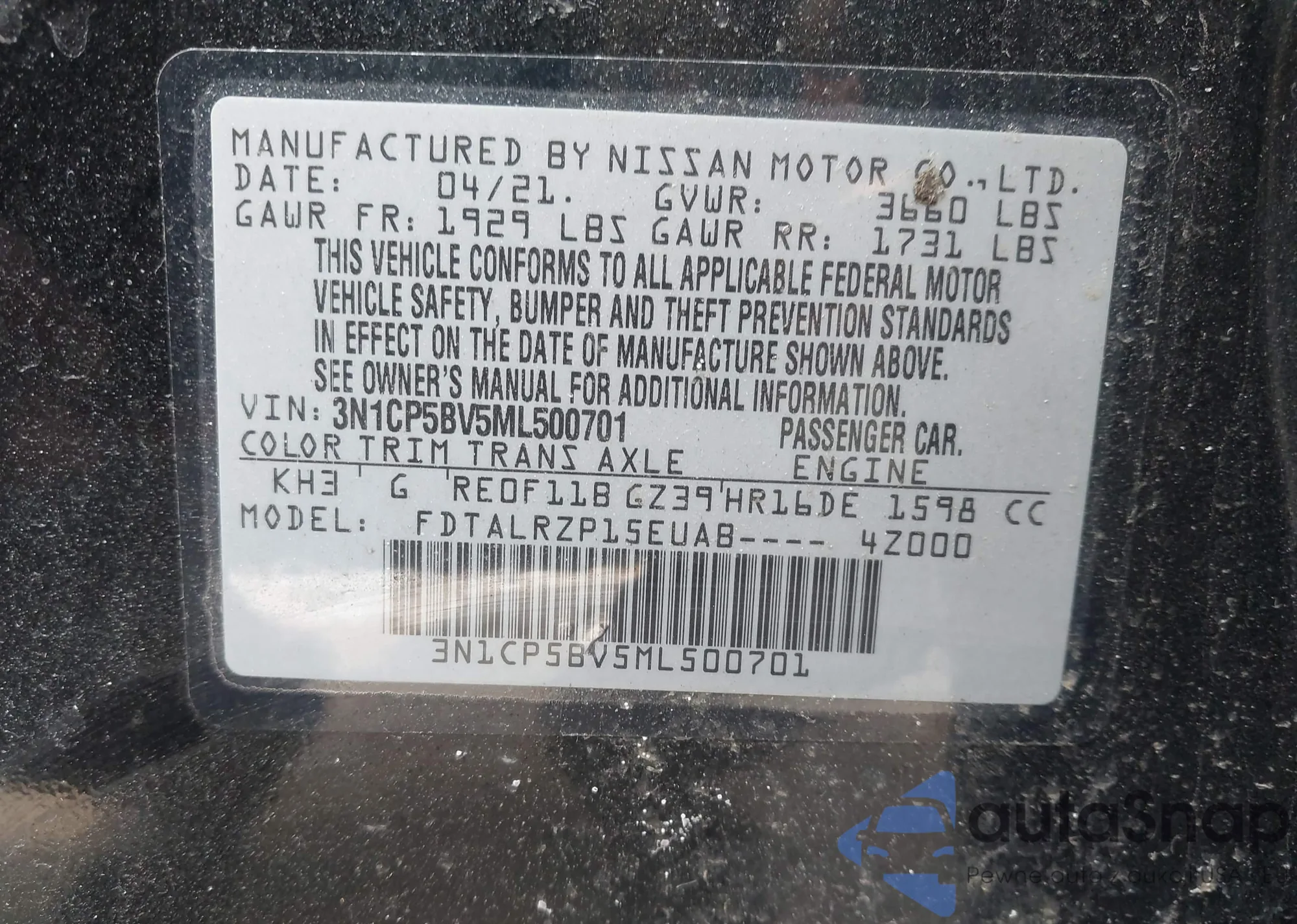 • VIN: 3N1CP5BV5ML500701