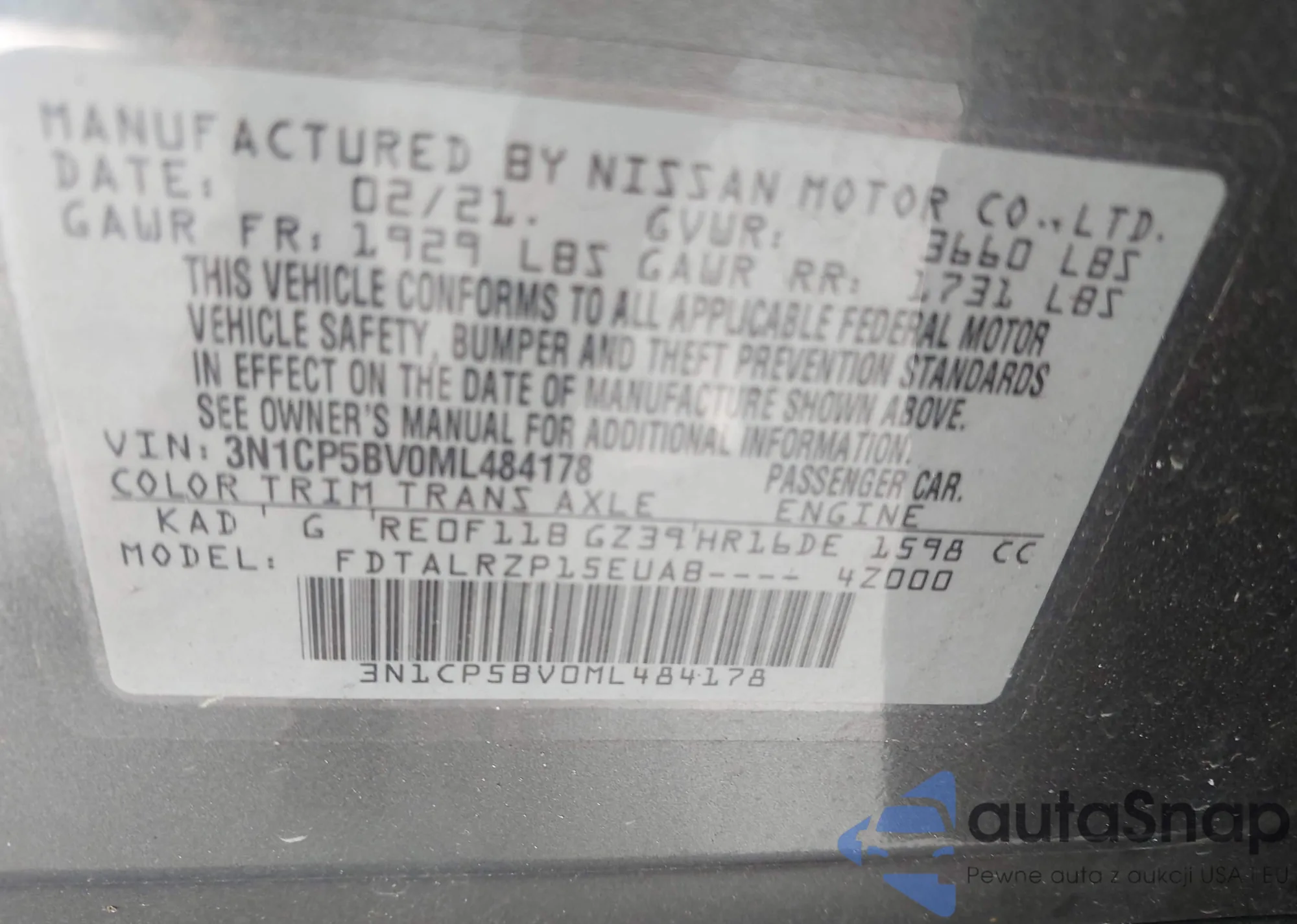 VIN: 3N1CP5BV0ML484178