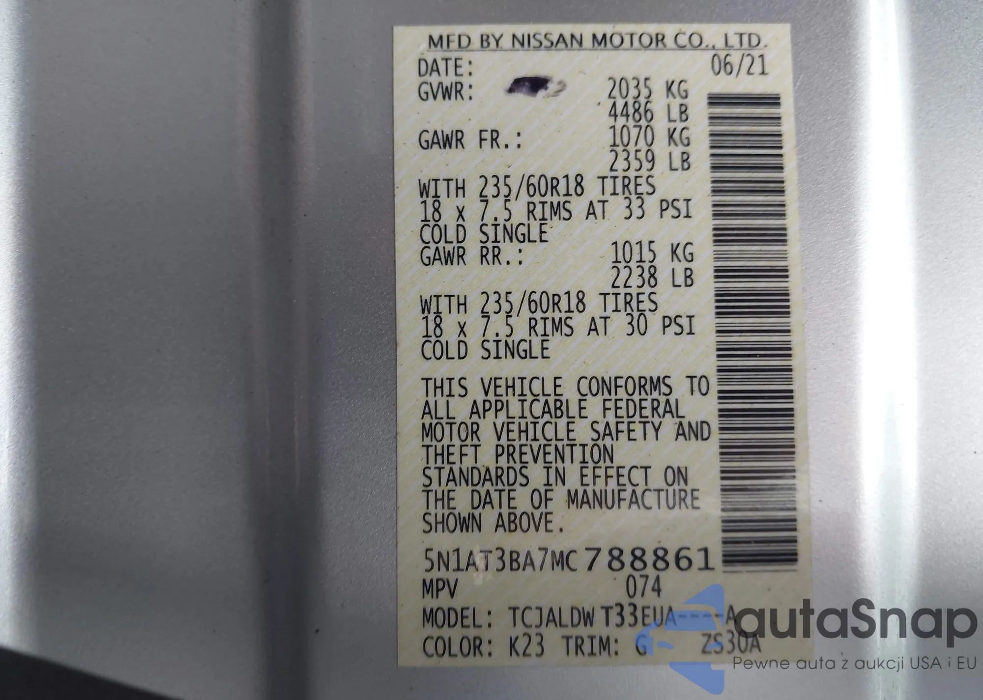 The car Nissan Rogue 2021 (VIN 5N1AT3BA7MC788861) has not been auctioned before. The documents are clean, and the mileage matches or is below the market average. Sold by an insurance company – we recommend purchase. Delivery to the port will take approx. 6–8 weeks.