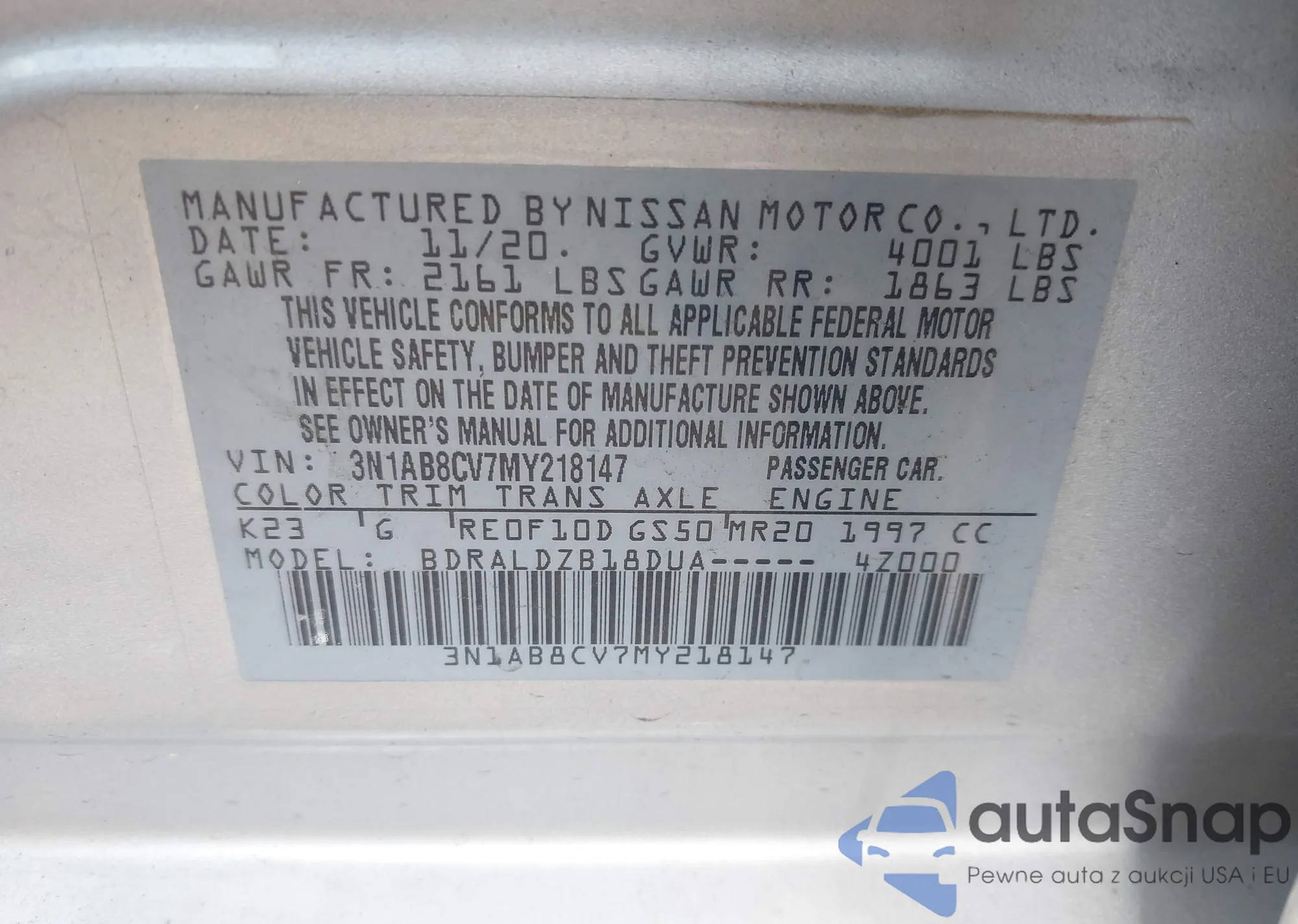 VIN: 3N1AB8CV7MY218147