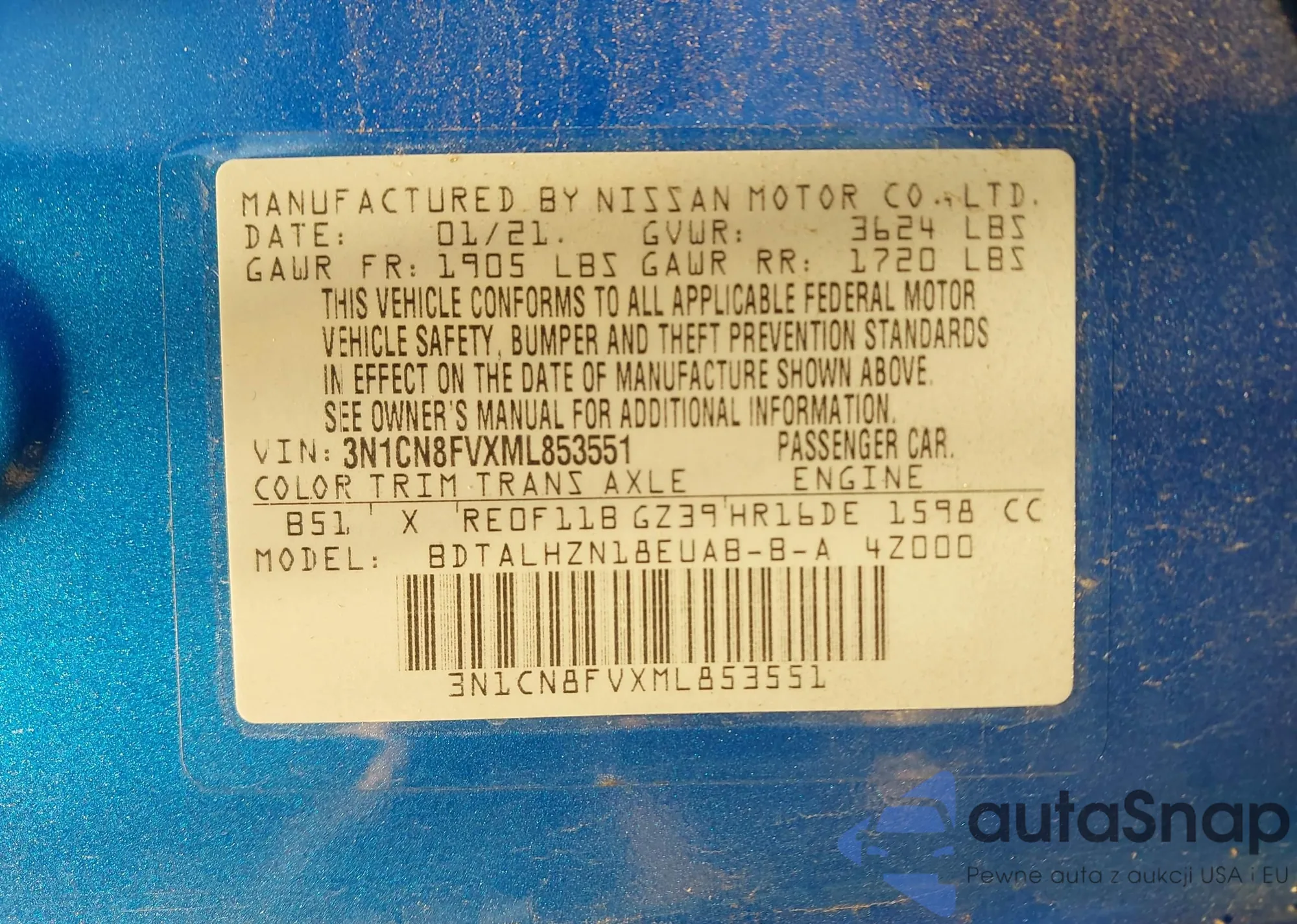 The car Nissan Versa 2021 (VIN 3N1CN8FVXML853551) has not been auctioned before. The documents are clean, and the mileage matches or is below the market average. Sold by an insurance company – we recommend purchase. Delivery to the port will take approx. 6–8 weeks.