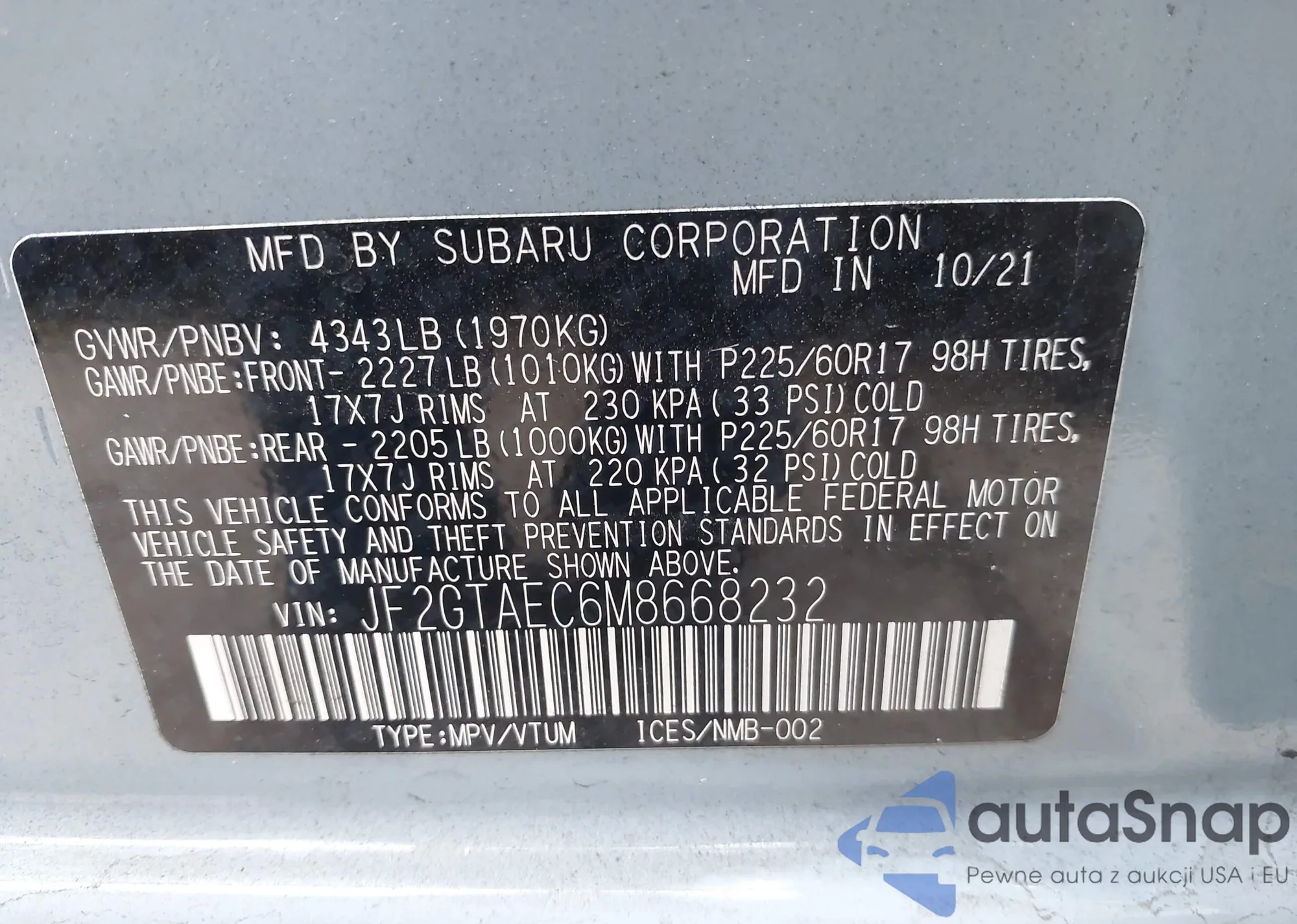 • VIN: JF2GTAEC6M8668232