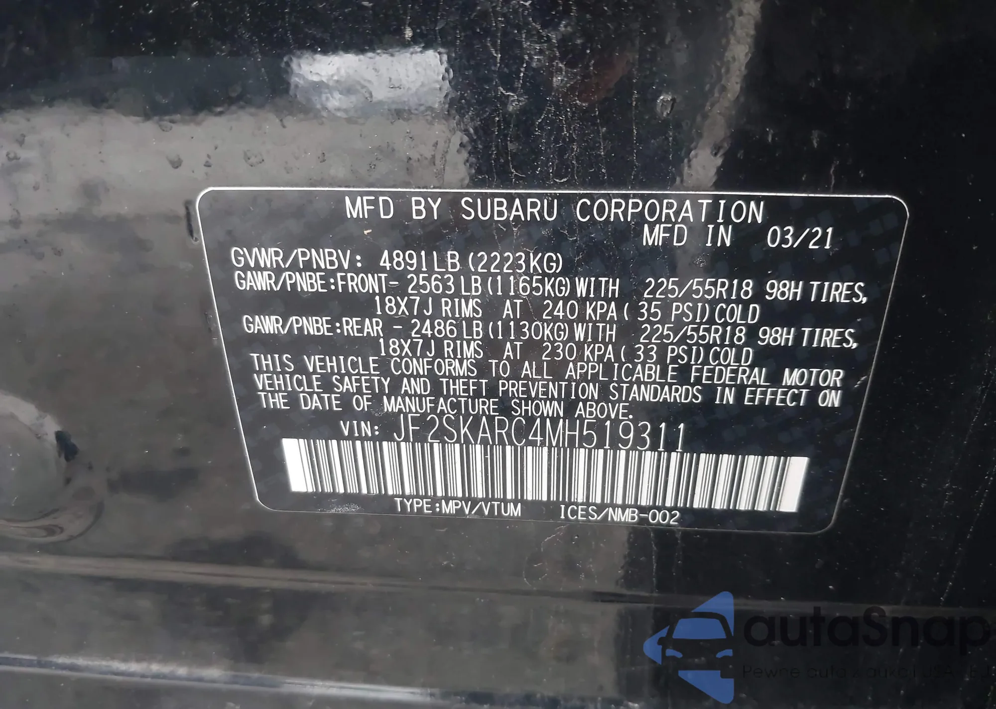 • VIN: JF2SKARC4MH519311