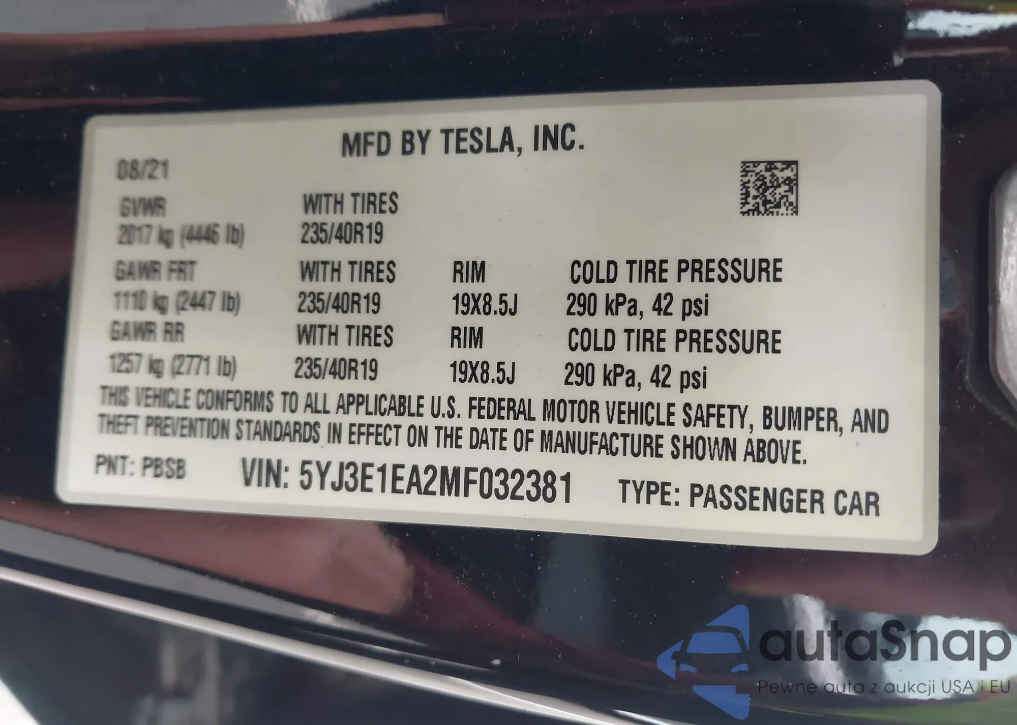 The car Tesla Model 3 2021 (VIN 5YJ3E1EA2MF032381) has not been auctioned before. The documents are clean, and the mileage matches or is below the market average. Sold by an insurance company – we recommend purchase. Delivery to the port will take approx. 6–8 weeks.