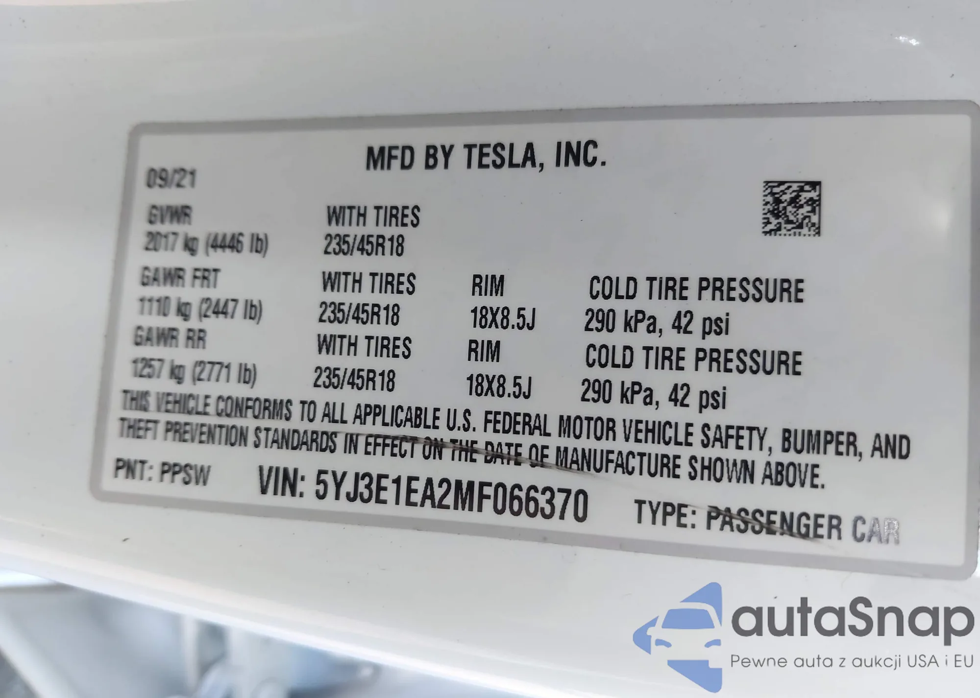 VIN: 5YJ3E1EA2MF066370