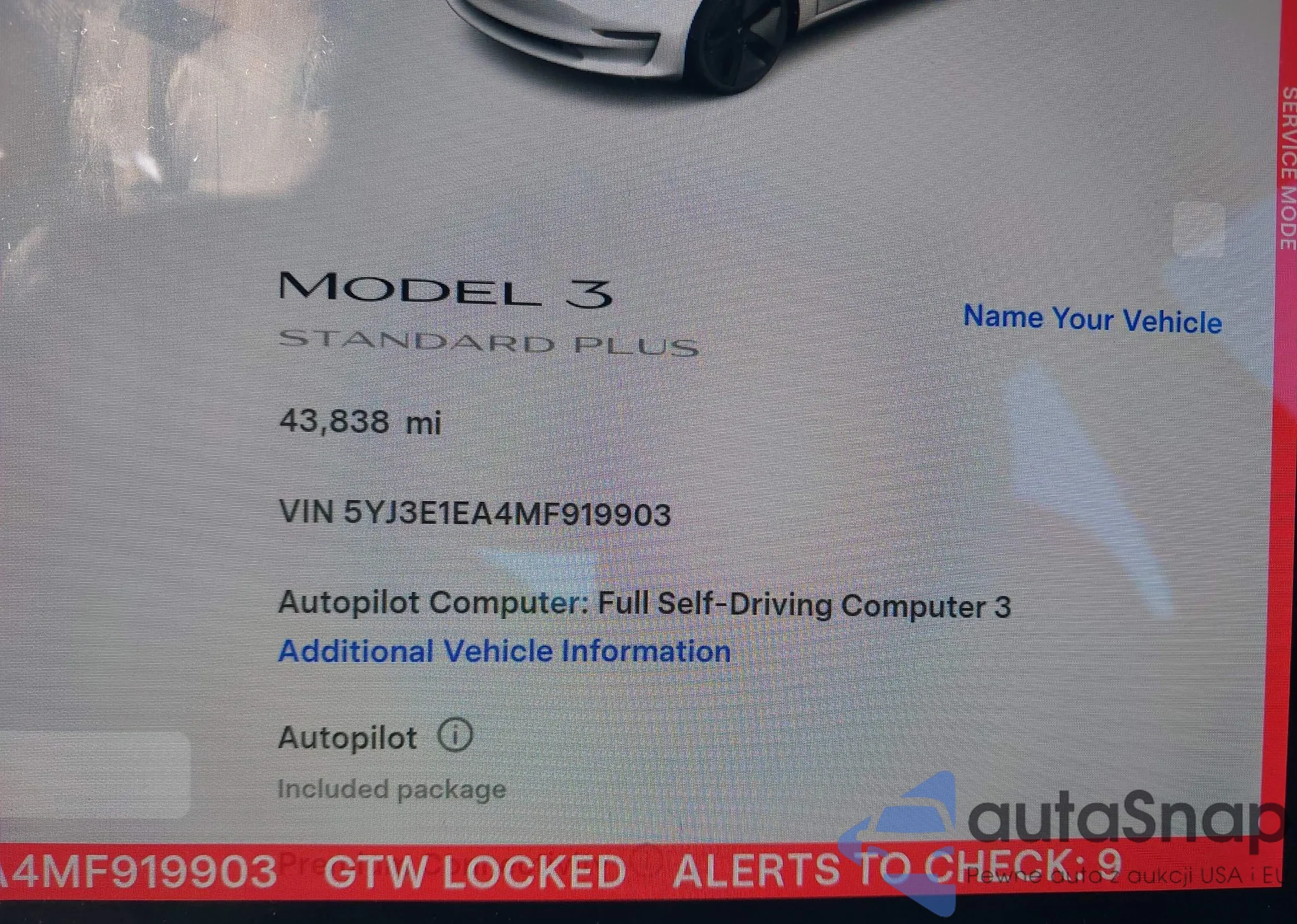 The car Tesla Model 3 2021 (VIN 5YJ3E1EA4MF919903) has not been auctioned before. The documents are clean, and the mileage matches or is below the market average. Sold by an insurance company – we recommend purchase. Delivery to the port will take approx. 6–8 weeks.