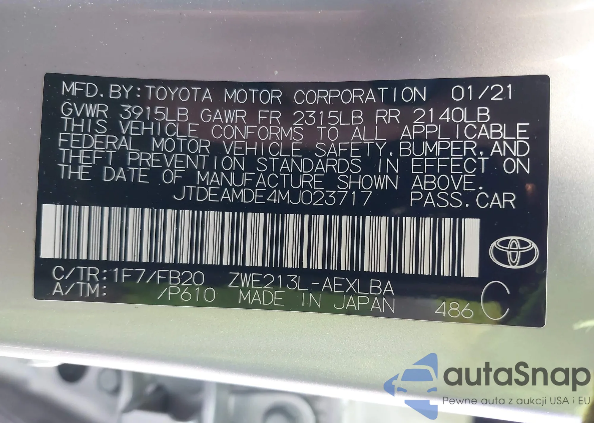 The car Toyota Corolla 2021 (VIN JTDEAMDE4MJ023717) has not been auctioned before. The documents are clean, and the mileage matches or is below the market average. Sold by an insurance company – we recommend purchase. Delivery to the port will take approx. 6–8 weeks.
