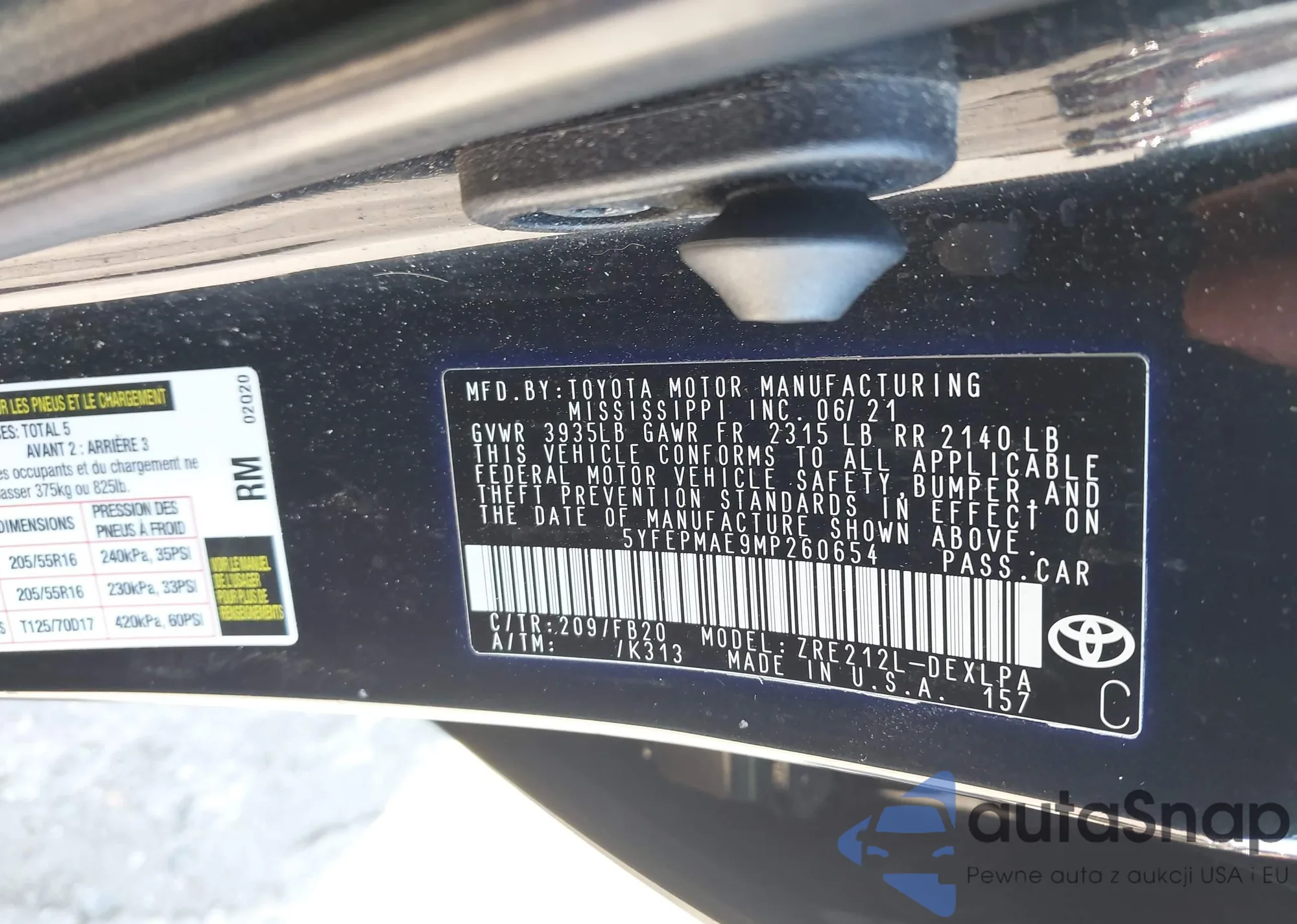 The car Toyota Corolla 2021 (VIN 5YFEPMAE9MP260654) has not been auctioned before. The documents are clean, and the mileage matches or is below the market average. Sold by an insurance company – we recommend purchase. Delivery to the port will take approx. 6–8 weeks.